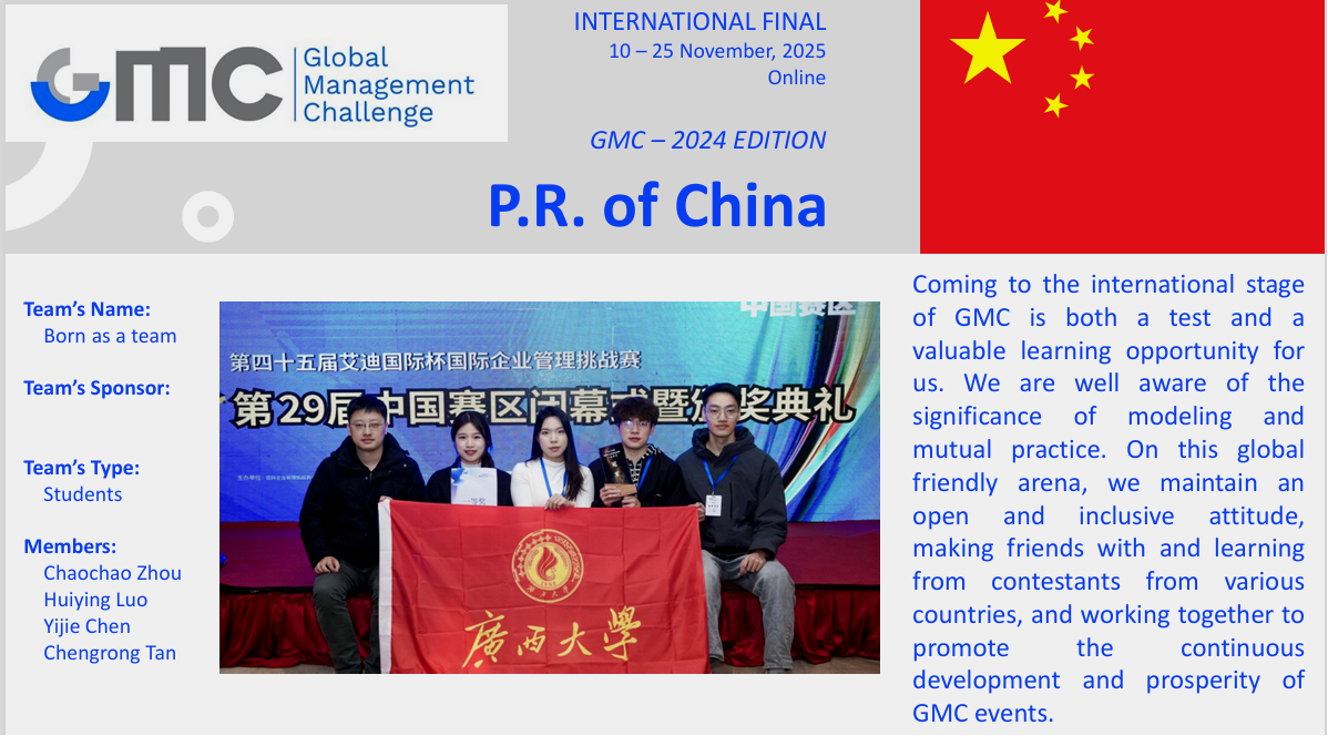 On November 25, 2025, the online award ceremony and closing event of the 45th (2024) Global Management Challenge (GMC) International Finals was held. The 'Tian Sheng Yi Dui' team, mentored by Associate Professor Chen Weihong from China-ASEAN School of Economics and comprising Zhou Chaochao (postgraduate student from 2024 Finance Master Programme), Luo Huiying and Chen Yijie (postgraduate studen...