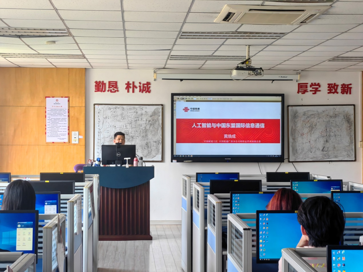 4月25日,我院国际经济与贸易系在《电子商务理论与实践》课程中创新开展校企联合教学实践,邀请中国联通广西分公司网络运营部高级总监黄焕成走进本科课堂,以“行业专家+场景教学”模式,为学生带来《人工智能与中国东盟国际信息通信》专题授课。