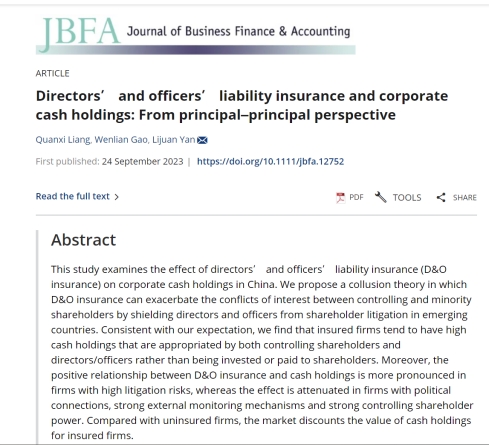 日前,经济学院梁权熙教授和美国北伊利诺伊大学高文莲(Wenlian Gao)助理教授、北京联合大学闫丽娟助理教授合作的论文“Directors' and Officers' Liability Insurance and Corporate Cash Holdings: From Principal–principal Perspective”在财经类国际权威期刊Journal of Business Finance & Accounting接受发表。