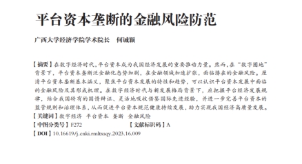 日前,beat365手机版官网入口经济学院/中国-东盟金融合作学院何诚颖教授的论文《平台资本垄断的金融风险防范》正式发表于人民论坛·学术前沿(2023年第16期)。作者分析了数字经济时代平台资本垄断泛金融化的态势,厘清了平台资本垄断基本涵义,聚焦了平台资本发展的特性和趋势,认识了平台资本发展中面临的金融风险及其形成机理,并提出了相关政策建议。