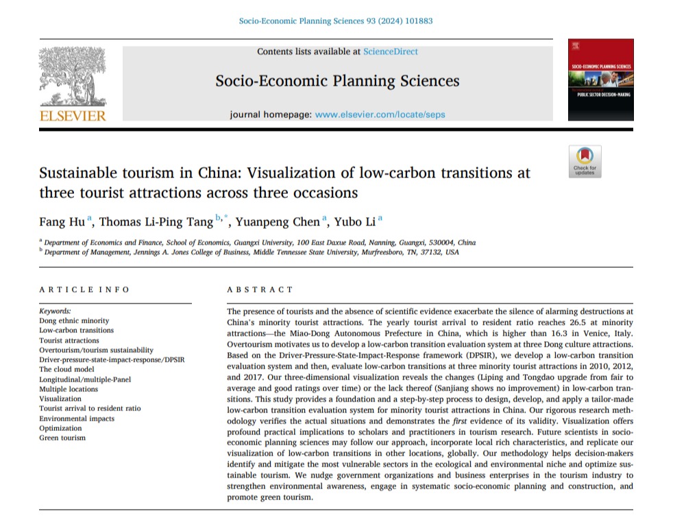 日前,我院胡芳老师作为第一作者与硕士研究生陈渊鹏和李誉博、美国中田纳西州立大学Thomas Li-Ping Tang教授共同完成的学术论文“Sustainable Tourism in China: Visualization of Low-Carbon Transitions at Three Tourist Attractions across Three Occasions”(《中国的可持续旅游:三个旅游景点在三个时期的低碳转型可视化》)在经济学领域国际权威期刊Socio-Economic Planning Sciences在线发表。该研究得到国家自然科学基金委和beat365手机版官网入口广西发展战略研究院的资助。