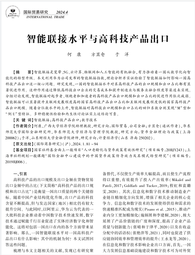 日前,我院何康助理教授及其合作者撰写的论文“智能联接水平与高科技产品出口”被中国人民大学书报资料中心复印报刊资料《国际贸易研究》2024年第4期全文转载。该文曾发表在《国际商务研究》2024年第1期。