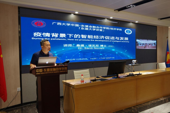2022年10月25日下午,我院举办“东盟大学讲堂”系列活动的第一场线上讲座,邀请来自印度尼西亚的桑提·诺瓦尼(Santi Novani)博士进行主讲。本次讲座活动除面向本学院本硕博学生,还向区内金融机构、国企、研究单位开放,参会人员踊跃,现场加线上超过340人聆听讲座。