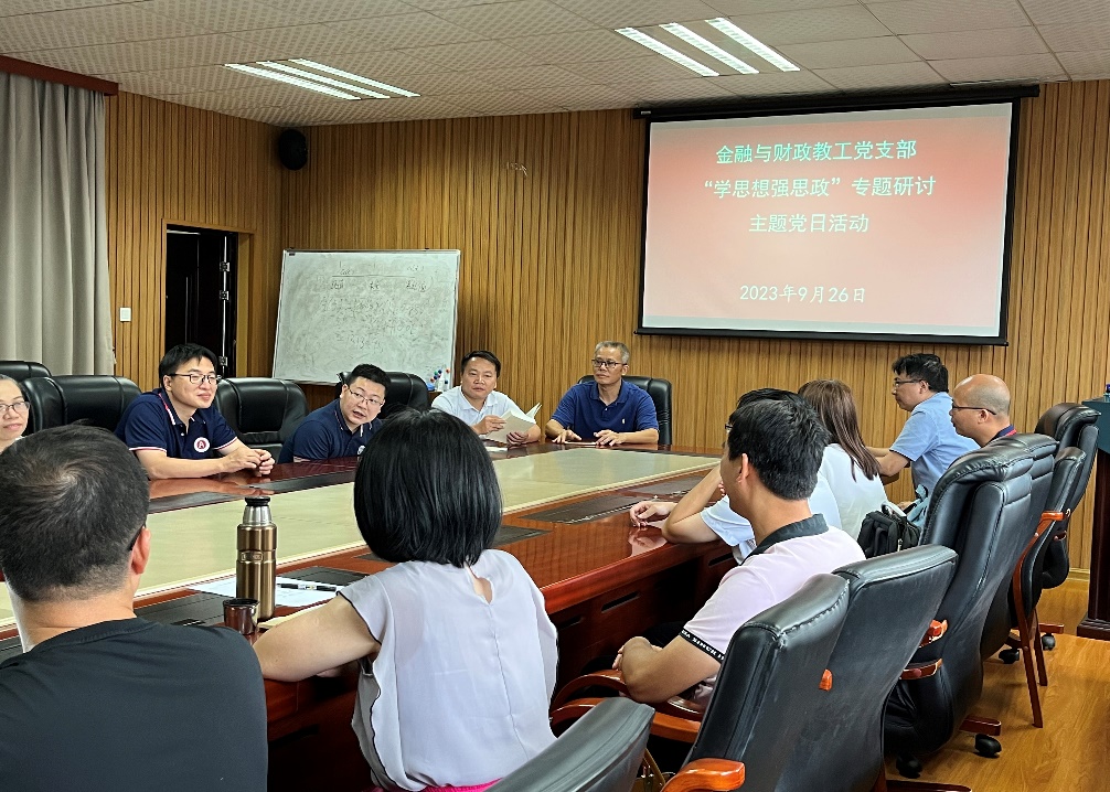 为全面推进课程思政建设,切实将学习贯彻习近平新时代中国特色社会主义思想主题教育与教学科研深度融合,强化党建引领高质量的人才培养,将“全员、全程、全课程”的育人工作格局落到实处,9月26日下午,经济学院/中国-东盟金融合作学院教工金融与财政党支部在MBA大楼316会议室开展了“学思想 强思政”专题研讨主题党日活动。研讨活动由支部书记陈新建主持,学院副院长谭春枝教授、副院长梁权熙教授、支部全体党员和部分非党员教师参加了研讨活动。