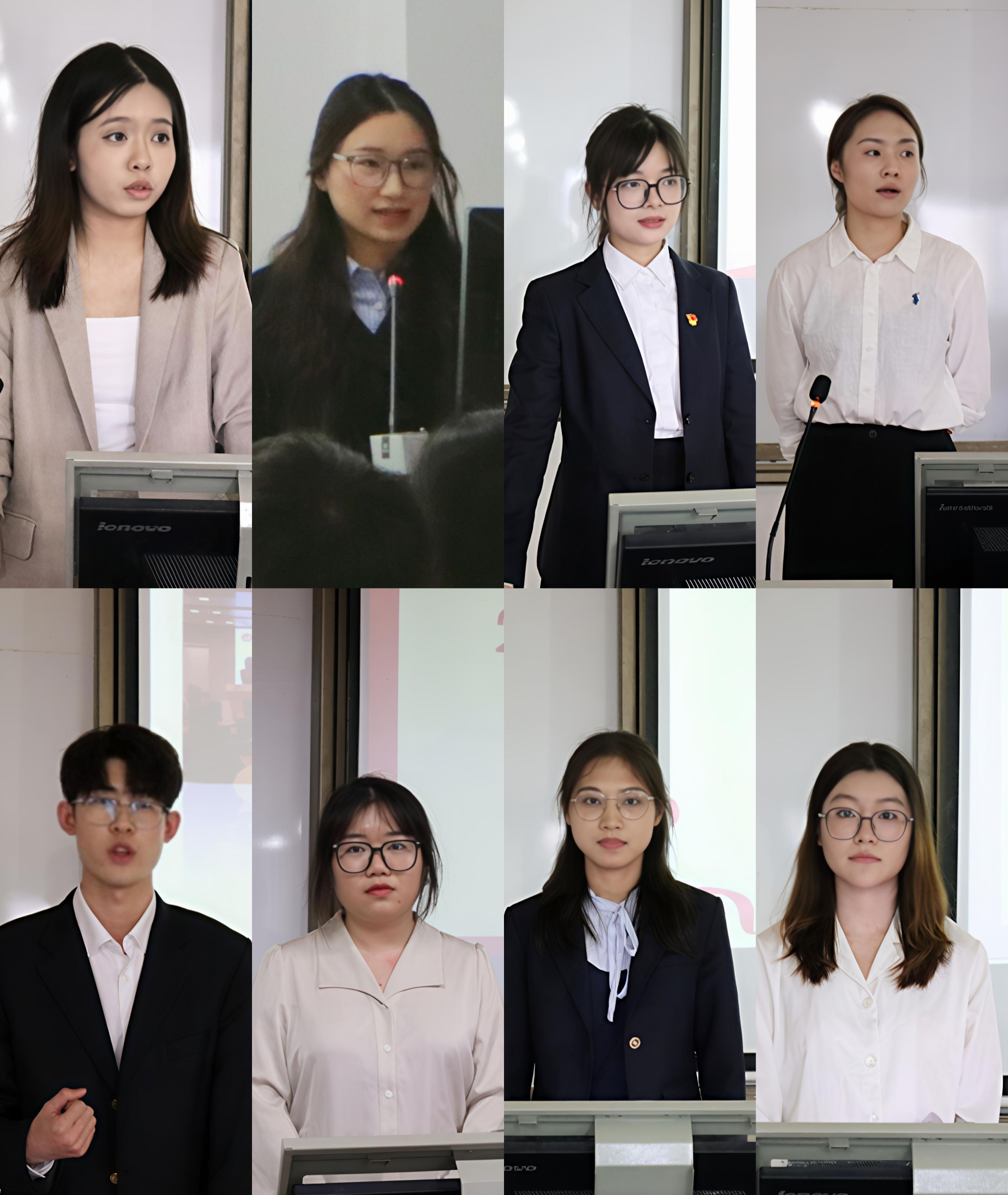 从左至右分别为学生会执行主席何佳璇、研究生会执行主席黄敏璇、党建工作秘书处秘书长卢玟君、就业服务秘书处秘书长石祖欣、“四创”学生管理秘书处秘书长姜帅、炎林连连长杨瑾瑜、同志连连长李慧怡、青年志愿者协会会长周琦