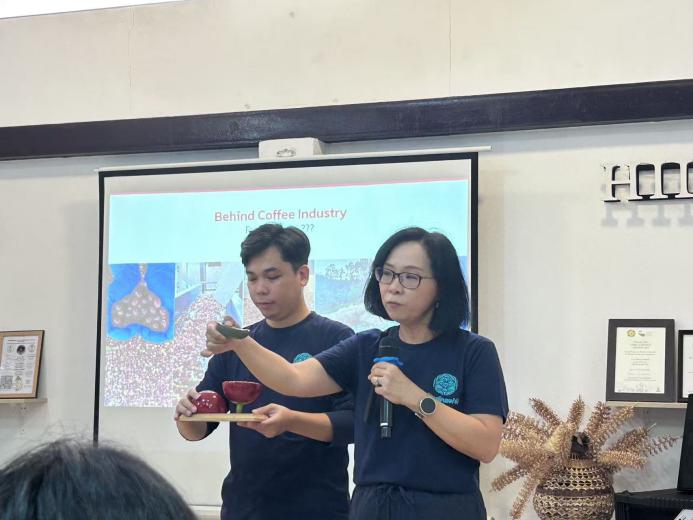 随后,师生一行换上防尘服深入烘焙车间、冷链仓库与感官实验室,实地体验“超级水果”的多重变身。娜鲁蒙女士向同学们介绍道:“咖啡可不只是我们日常生活中常见的饮品,它更是一种蕴含无限可能的‘超级水果’,具备健康、创新与可持续发展的多重潜力。希尔咖啡通过一系列资源循环工作,成功将咖啡产业‘可循环发展’的概念转化为实际成果,充分挖掘并发挥了咖啡豆作为特色农产品的多元价值。”同学们认真聆听,不时驻足观察,对咖啡产业的创新发展有了更为直观的感受。在互动环节,同学们围绕“小农嵌入价值链”“ESG与融资”“中国—东盟跨境标准互认”等话题踊跃提问。