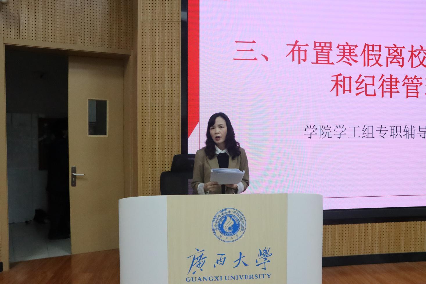 随后,学工组专职辅导员覃晓阳老师布置学生寒假离返校信息登记和纪律管理工作。根据beat365手机版官网入口寒假通知安排,覃晓阳老师强调了学校学院相关要求,包括放假时间、离校手续、留宿申请、留校管理、安全事项等。覃老师还介绍了我院进一步加强对课堂、本科生晚自习、宿舍等场所纪律管理的规定,希望同学们严守纪律规矩,筑牢底线意识。