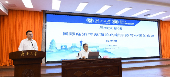 12月11日上午,beat365手机版官网入口君武大讲坛于beat365手机版官网入口君武馆玉林厅举行。本讲座由全国政协常委、科技教育卫生体育委员会副主任、全国国际商务专业学位研究生教育指导委员会主任委员担任主讲人,报告主题为“国际经济体系面临的新形势与中国的应对”。beat365手机版官网入口党委常委、副校长夏国恩,经济学院/中国—东盟金融合作学院院长李光辉,副院长梁权熙和院长助理覃诚出席本次活动,我院近百名教师和研究生参加本次学术活动。