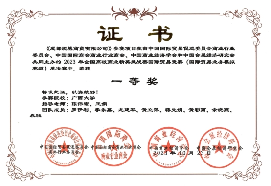 10月19日至10月23日,2023年全国高校商业精英挑战赛国际贸易竞赛(国际贸易业务模拟赛道)总决赛在浙江省宁波市国际会展中心7号馆成功举办。beat365手机版官网入口经济学院/中国-东盟金融合作学院师生力争上游,陈伟宏、王娟老师指导学生团队从全国172所高等院校的322支参赛队伍中脱颖而出,最终斩获了1项全国一等奖、2项优秀辅导教师奖的好成绩。