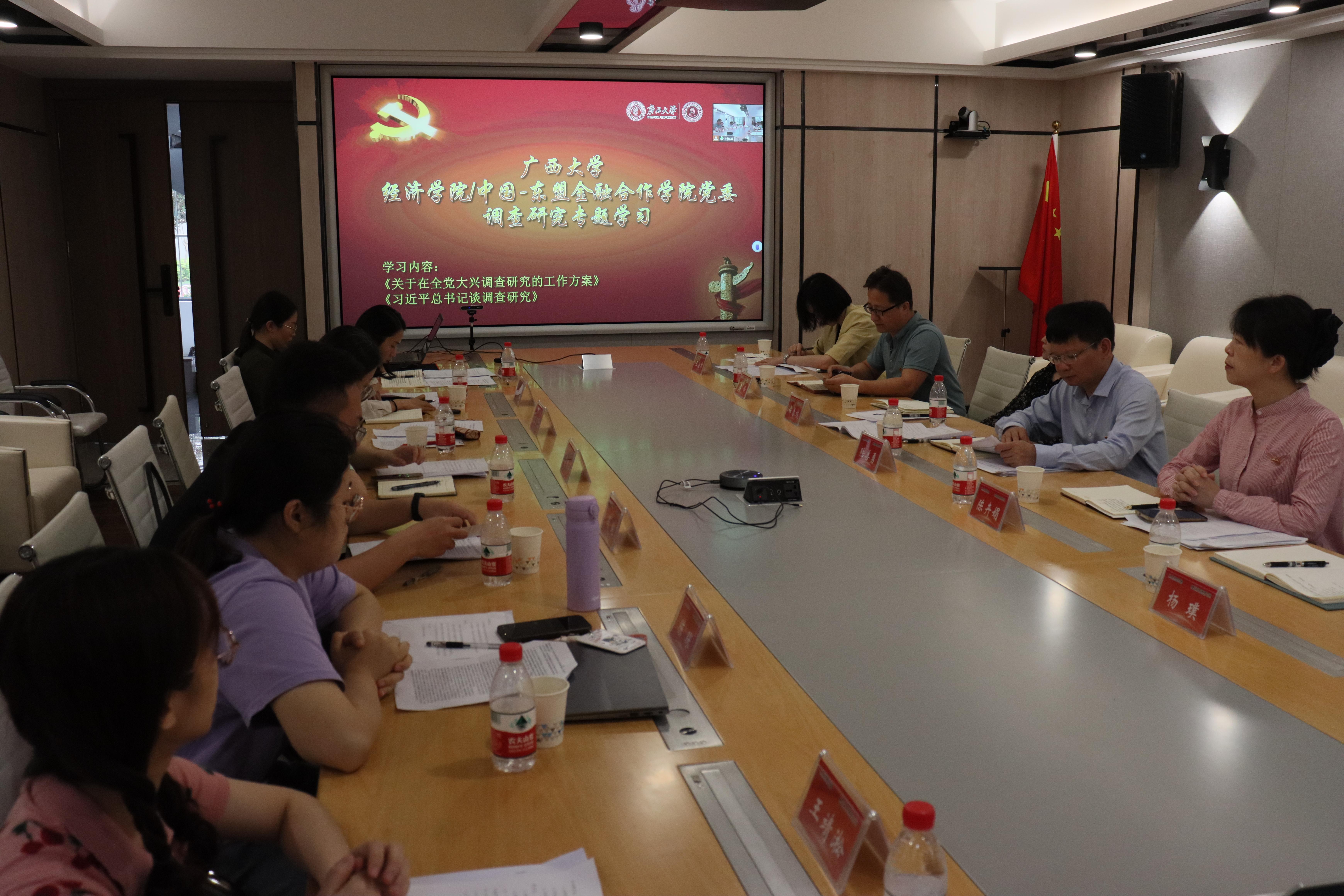 根据上级党组织关于学习贯彻习近平新时代中国特色社会主义思想主题教育的部署安排,4月20日,经济学院/中国-东盟金融合作学院党委在102会议室开展调查研究专题学习,beat365手机版官网入口党委委员、学院党委书记陆善勇领学并作专题辅导,学院党员领导干部、党支部书记、专职组织员参加学习。