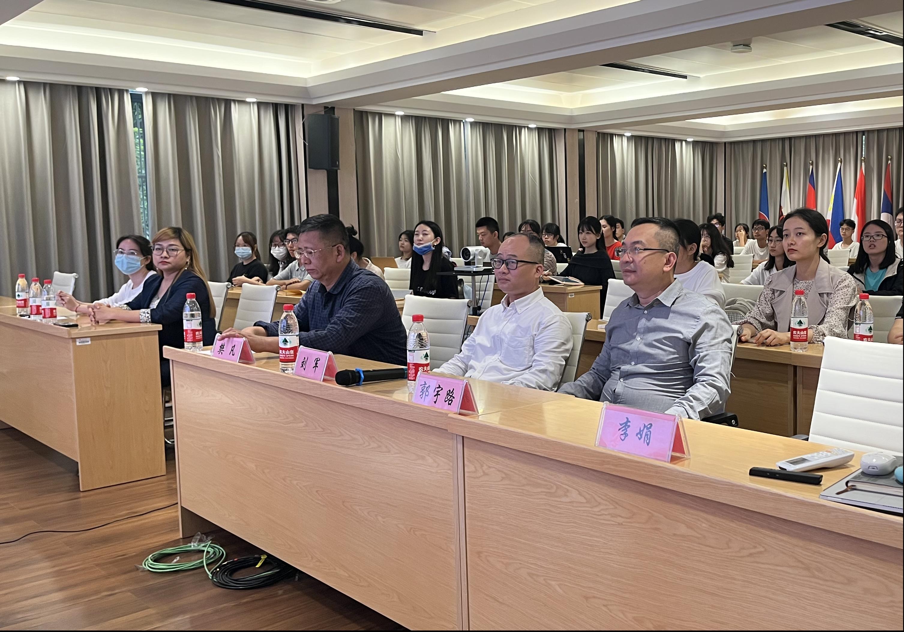 学院党委副书记、副院长郭宇路,广西职业师范学院外国语与国际教育学院院长刘军教授,学院国际交流专员樊凡教授、对外交流秘书李娟出席本次活动。我院中国-东盟金融经济创培班、经济管理创陪班以及研究生代表线上线下共计约360人参与讲座,同时本次活动还得到了区金融机构和企事业单位的大力支持,多家金融机构和国企管理人员在线参会。