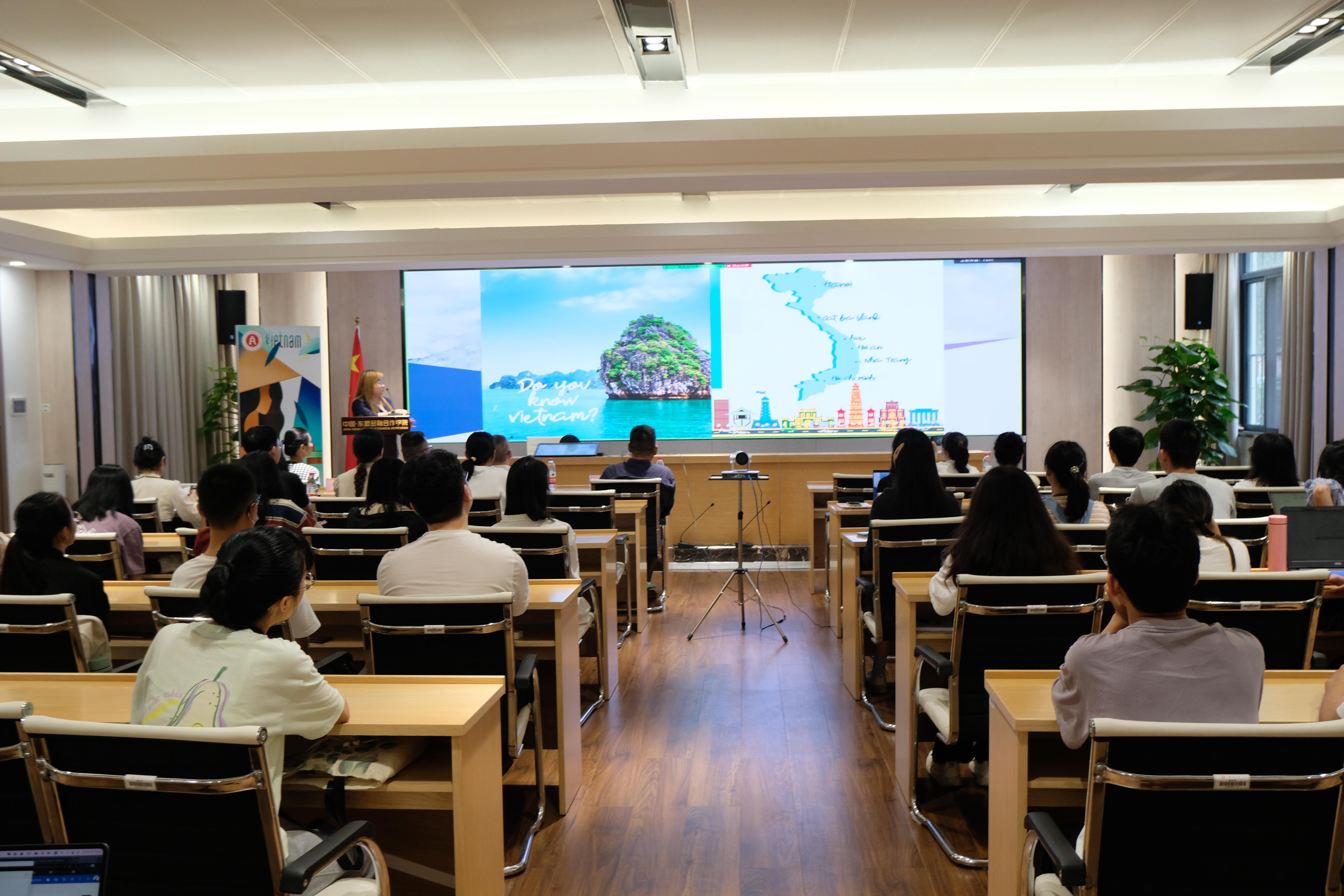 在互动问答环节,樊凡教授组织现场参会同学积极地向阮博士提问,所涉及的问题包括在低碳经济发展背景下越南在如何面对环境资源与经济发展、中国与越南在低碳经济层面的商贸合作等。