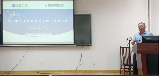 10月24日下午,阿联酋广西商会会长,广西南宁泰锦瑞商贸有限公司总经理,beat365手机版官网入口国际商务专业硕士合作导师黄仕标老师受邀做客我院国贸致新讲坛,为我院师生带来题为“中小微企业出口赛道品牌营销新模式的实践”的专题讲座。讲座吸引了学院近百名师生参与,尤其是国际贸易专业的本科生与国际商务专业的研究生,反应热烈。本次讲座由我院国贸系主任刘主光教授主持,王娟教授、陈伟宏助理教授等参与了本次讲座。