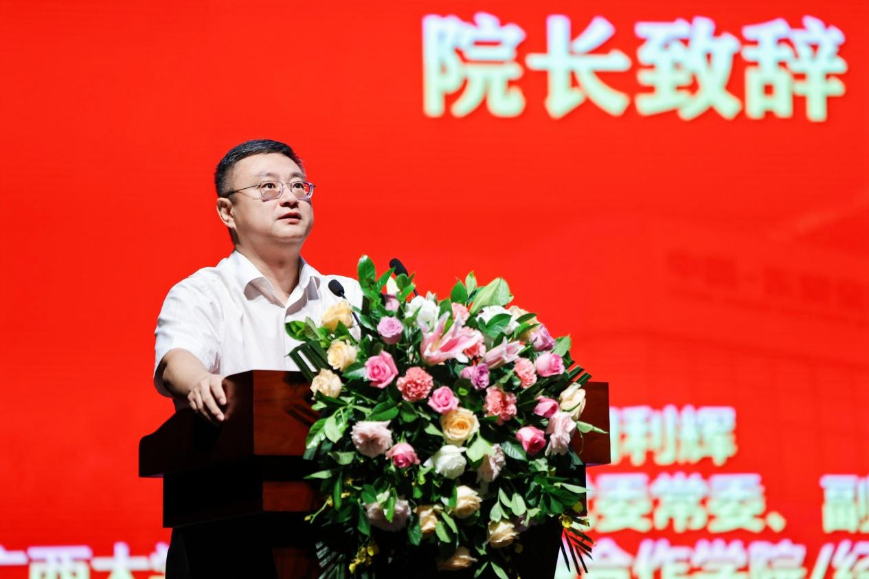 仪式的最后,田利辉副校长给新生们致辞。回溯过往,田利辉副校长将我院的发展历程娓娓道来;着眼当下,他介绍了我院的成立背景、已取得成就和建设目标,强调beat365手机版官网入口中国-东盟金融合作学院/经济学院不仅是建设一流学科的学院,更是践行国家重大战略的学院;展望未来,田副校长号召全院上下传承和发扬“勤恳朴诚、厚学致新”的校训,致力于为中国东盟合作培养高质量经济金融人才、打造资政高端智库和多边金融合作平台、推动beat365手机版官网入口应用经济学跻身于国家一流学科、服务广西经济更快更好地发展。田副校长表示:“发达广西、复兴中华”目标的实现,需要我们共同努力。同学们是国家民族的未来,希望大家爱党爱国爱校爱家,做思想好、学习好、身体好的进步青年,在大学这个崭新的起点,保持初心如磐、追求知行合一、立志发奋图强、坚持奋楫笃行,用奋斗书写无悔青春、无悔人生!