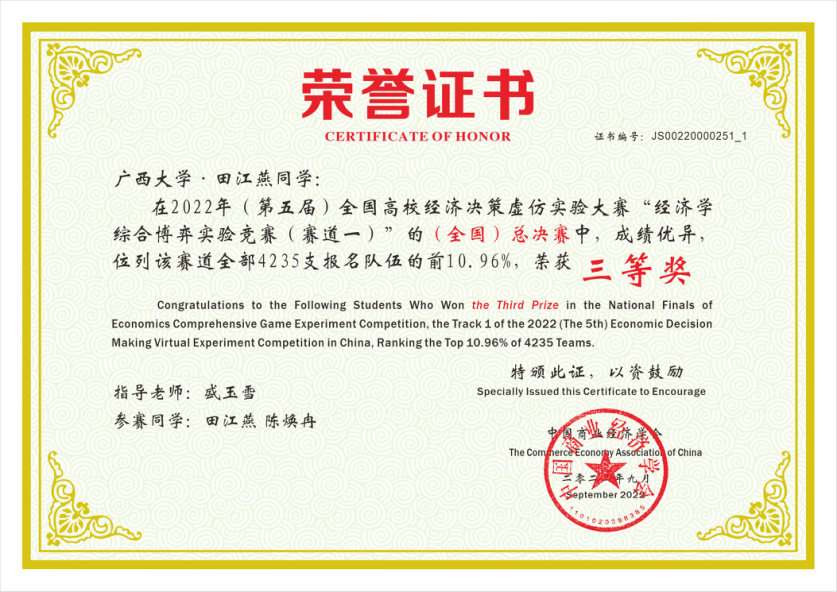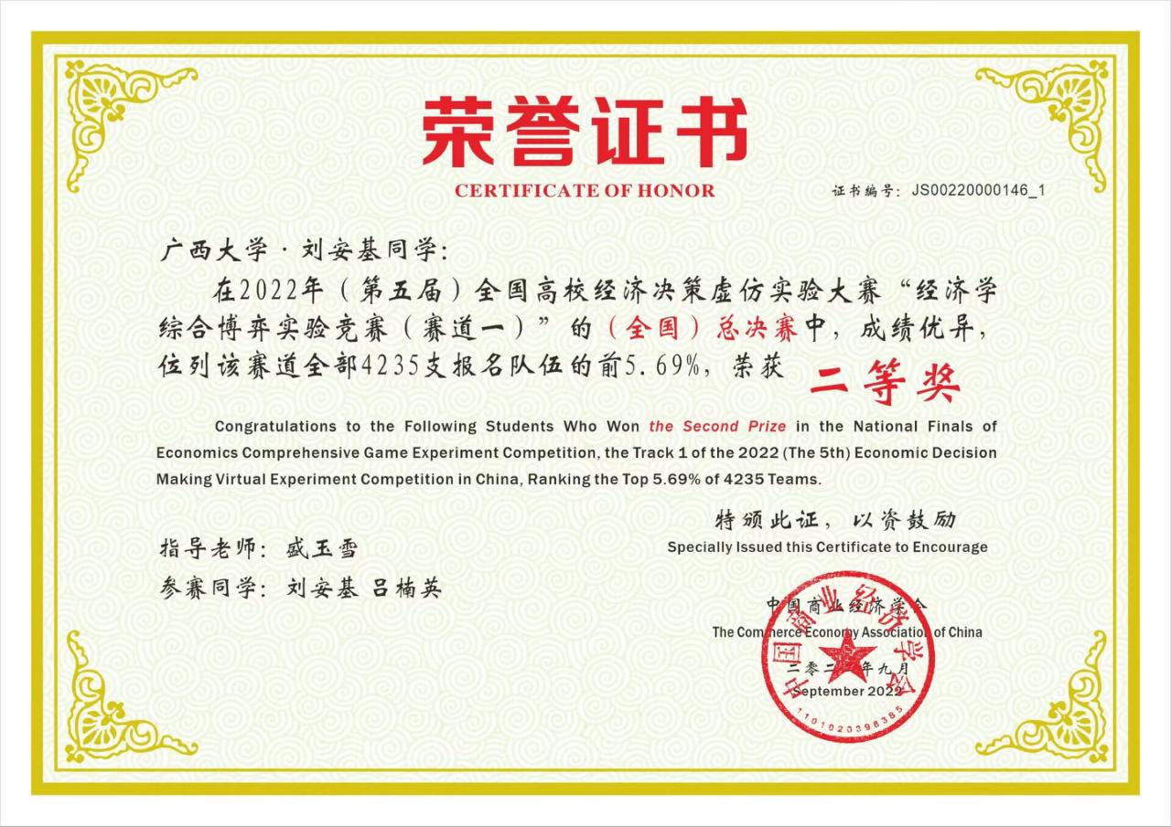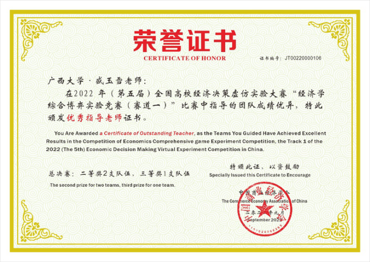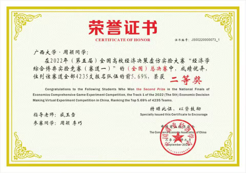 9月14日,2022年(第五届)全国高校经济决策虚仿实验大赛完美落幕。通过与来自全国252所高校4235支队伍的层层角逐,我院经济学系盛玉雪老师指导的三支本科生队伍在经济学综合博弈实验竞赛赛道的全国总决赛中取得了两项二等奖、一项三等奖,一项“优秀指导老师”的好成绩。