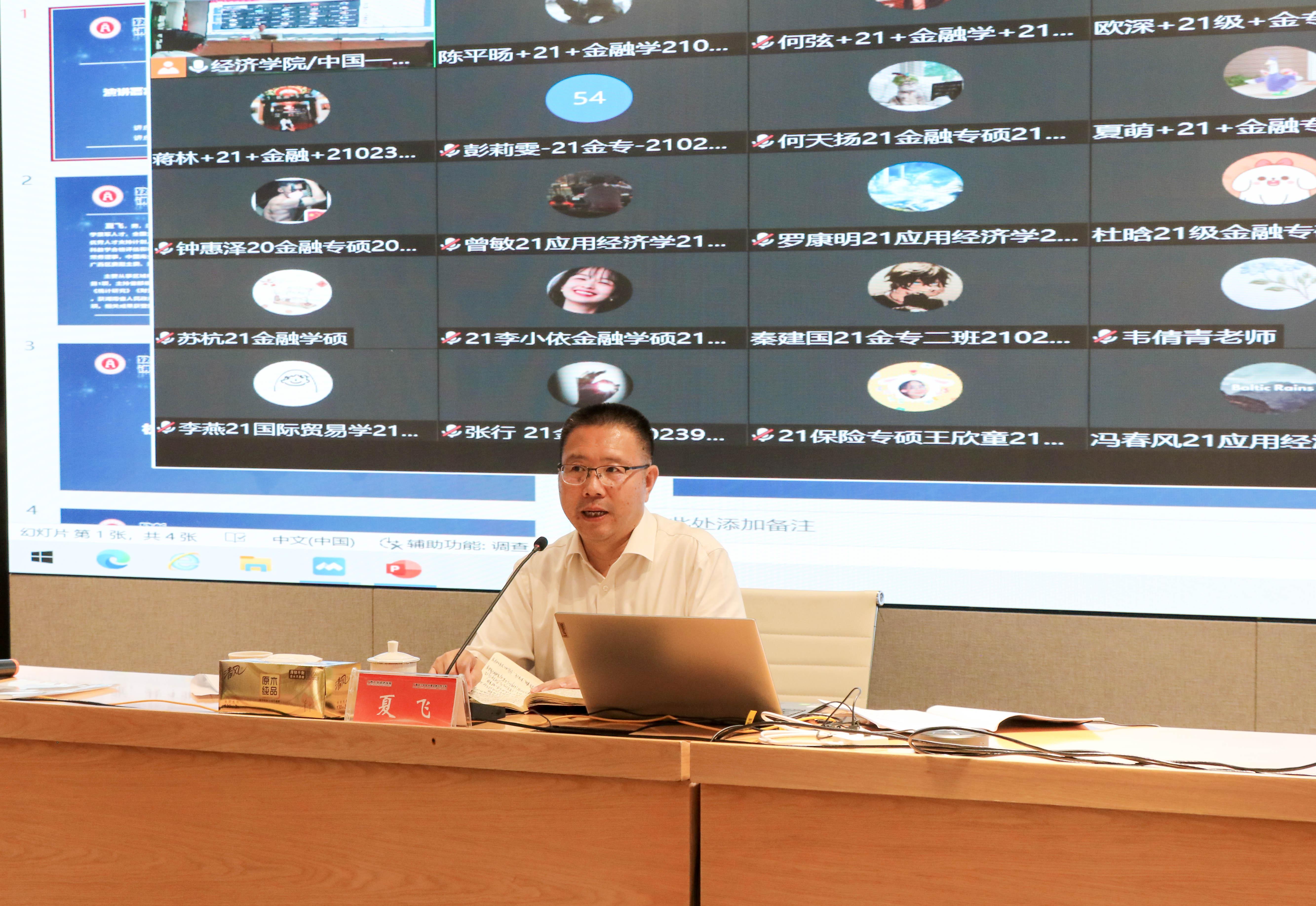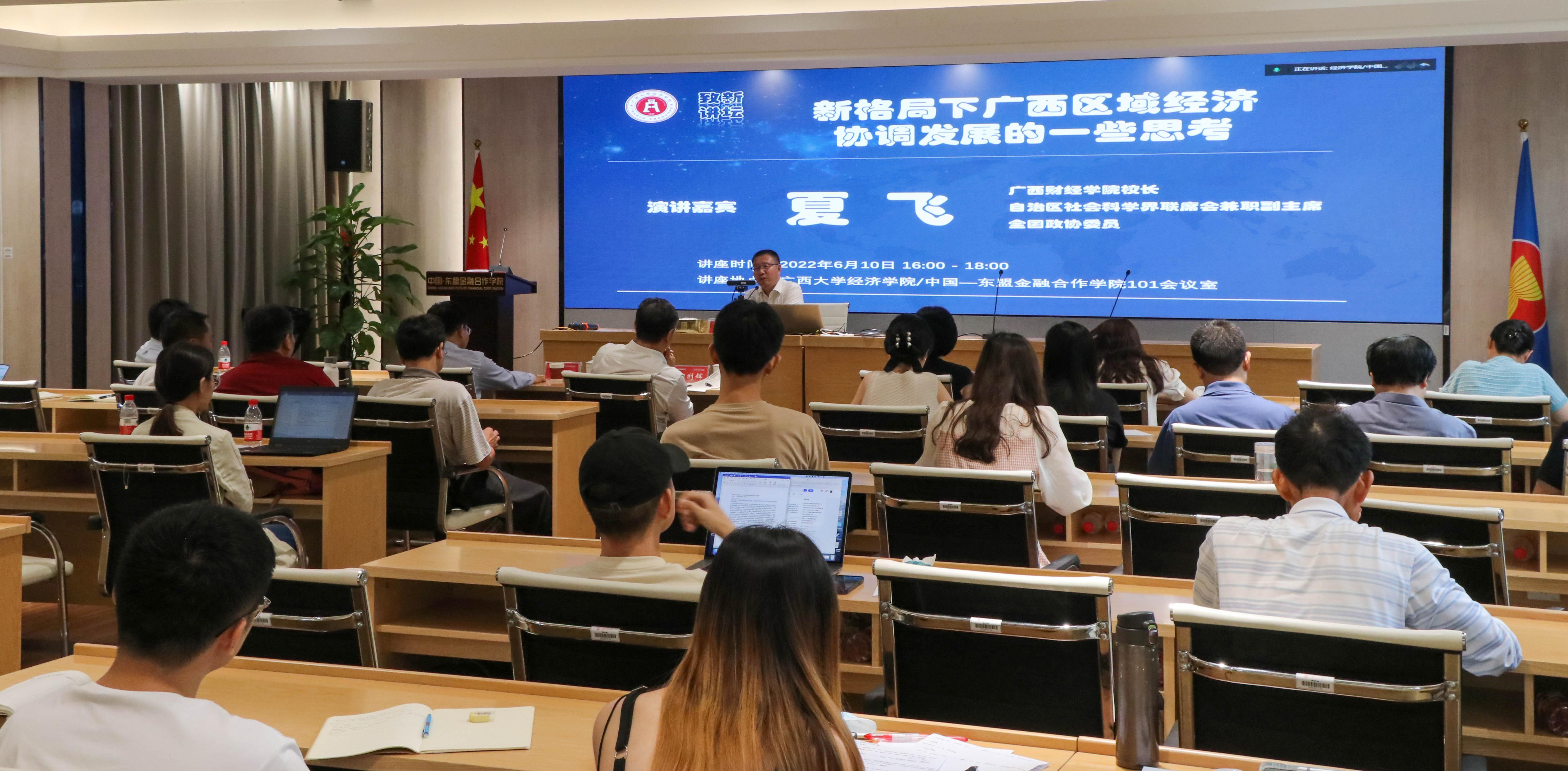 6月10日,beat365手机版官网入口经济学院/中国—东盟金融合作学院2022年第4期“致新大讲坛”如期举行,广西财经学院校长、自治区社会科学界联席会兼职副主席、全国政协委员夏飞教授为学院上百名师生带来题为“新格局下广西区域经济协调发展的一些思考”的专题讲座。讲座以线下和线上结合的方式进行,我校党委常委、副校长、学院院长田利辉教授主持讲座。