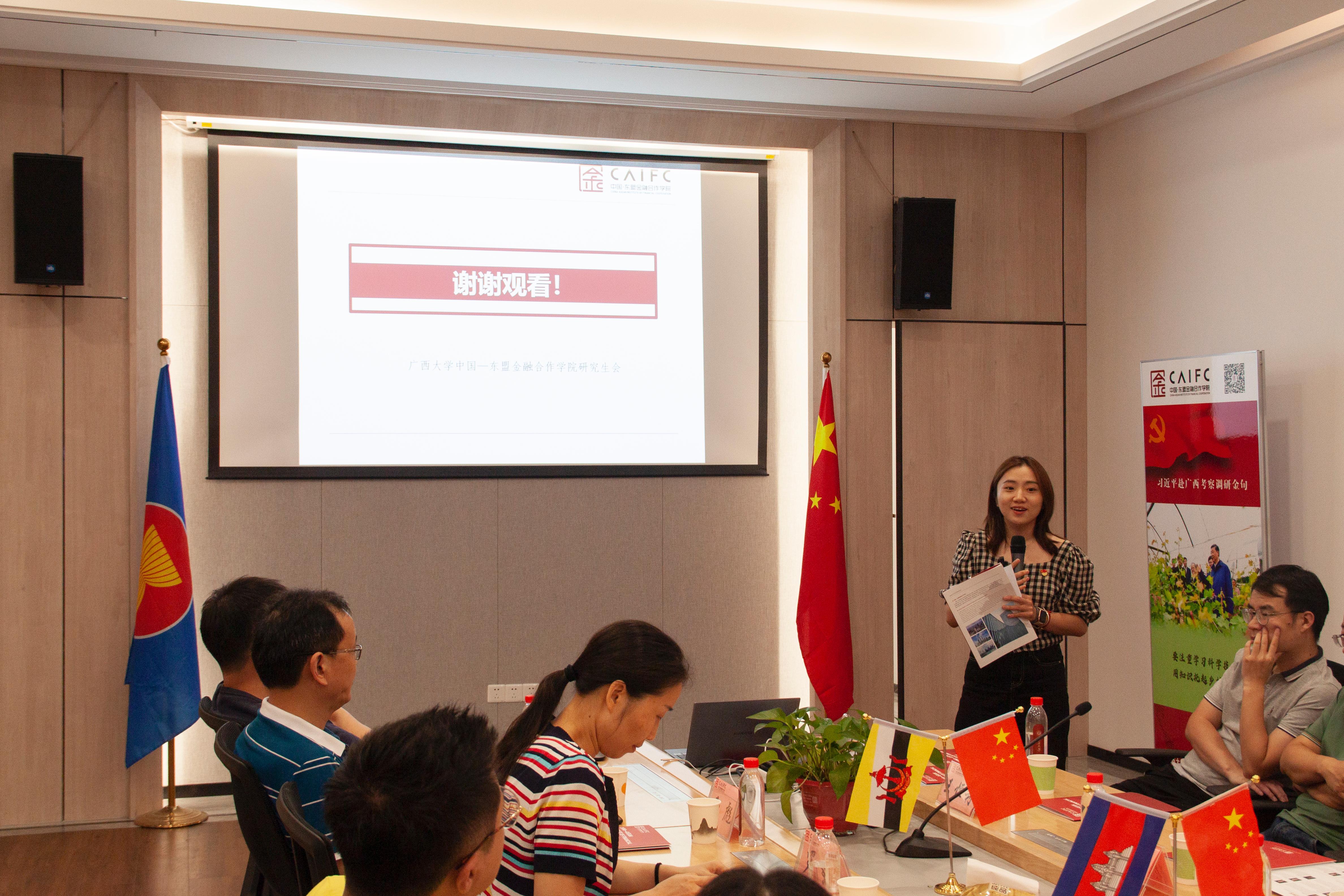 东金院研究生会主席张甜甜依次介绍了学院本学期开展的“走进七彩东盟”小语种培训、越南专题讲座、东盟礼仪课堂等系列东盟文化活动,旨在通过举办东盟文化活动,不断增进文明互鉴,为促进中国与东盟国家的人文交流发挥积极作用。