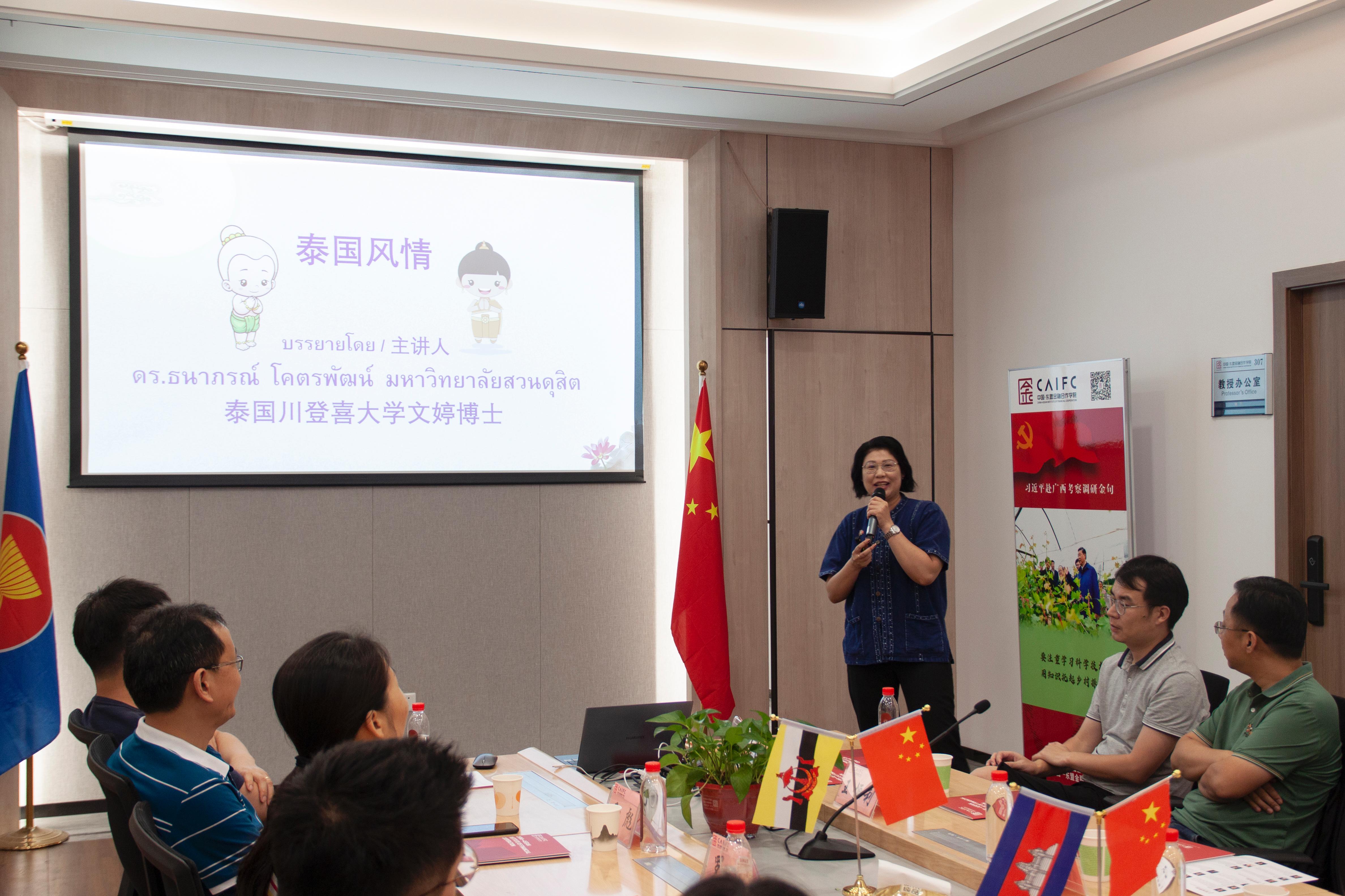 7月13日,继beat365手机版官网入口EMBA东盟之夜茶话会后,我院再次举办beat365手机版官网入口EMBA东盟文化交流活动。本次活动围绕中泰文化交流、商业文化、经济合作开展,邀请泰国素攀孔子学院前院长文婷博士、beat365手机版官网入口东盟学院泰语外教泰露露博士作为主讲嘉宾,我院副书记郭宇路、对外联络部部长李晨辛出席。