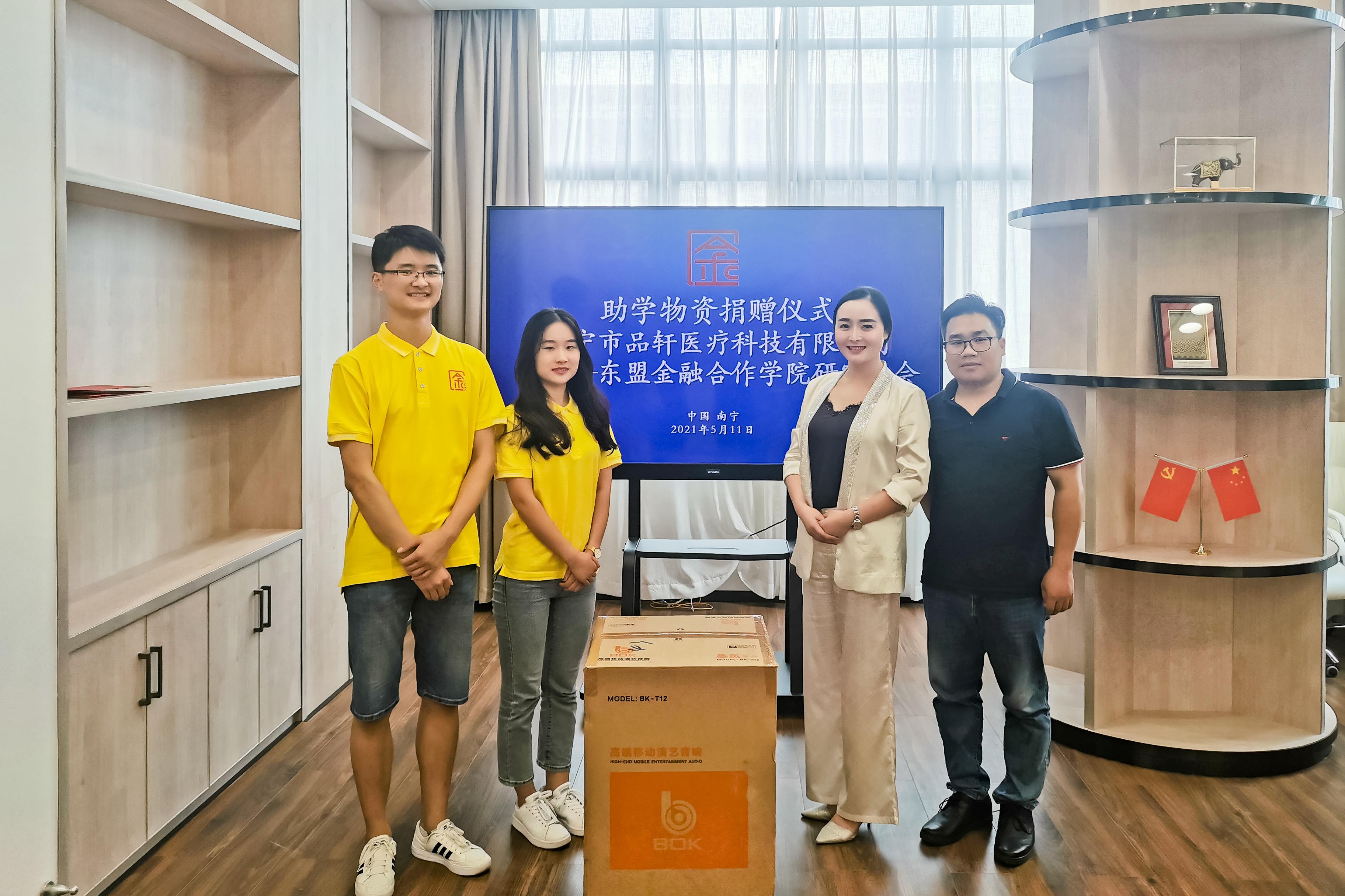 5月11日,南宁品轩医疗科技有限公司张丽媛副总经理一行三人到访beat365手机版官网入口中国—东盟金融合作学院,并向我院捐赠高端移动演艺音响一套,助力我院研究生会开展学习教育活动。院研究生会主席林衍和学生党支部副书记夏盛世代表院研会接受了助学物资捐赠。学院党总支副书记郭宇路、办公室主任王峰出席了捐赠仪式。