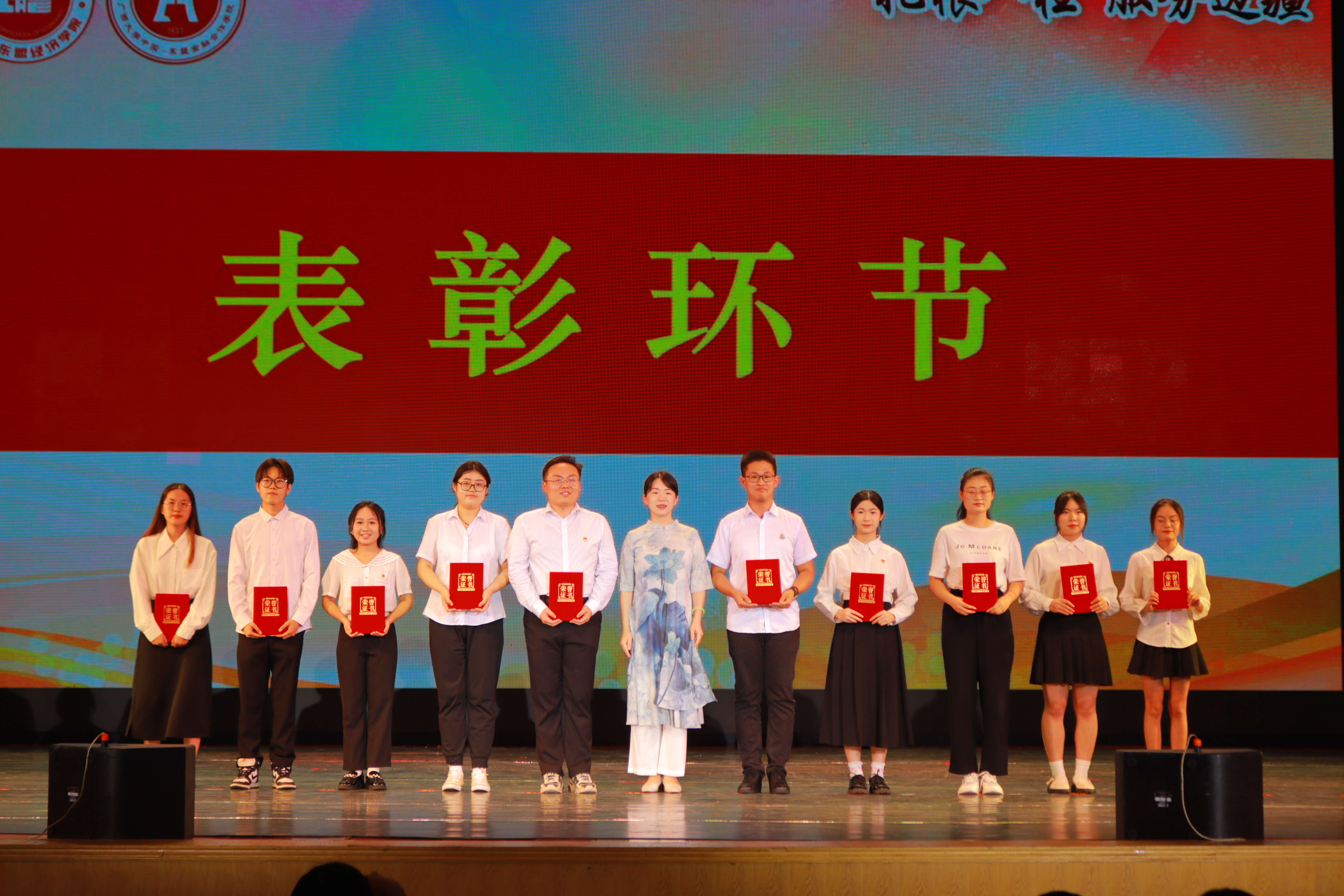 为勉励经院学子向优秀榜样看齐,向着更高的目标和更光明的未来奋勇前行,晚会设置了表彰环节。院党委常务副书记罗诚、党委副书记陈卉娟、副院长梁权熙分别为上一年度我院国家奖学金获得者、自治区人民政府奖学金获得者、自治区优秀毕业生以及校级优秀学生个人和先进学生集体颁奖。获奖的学生和集体用实际行动展现了经院学子孜孜以求、勇攀高峰、开拓进取、向上向善的精神风貌,为同学们树立了优秀榜样。