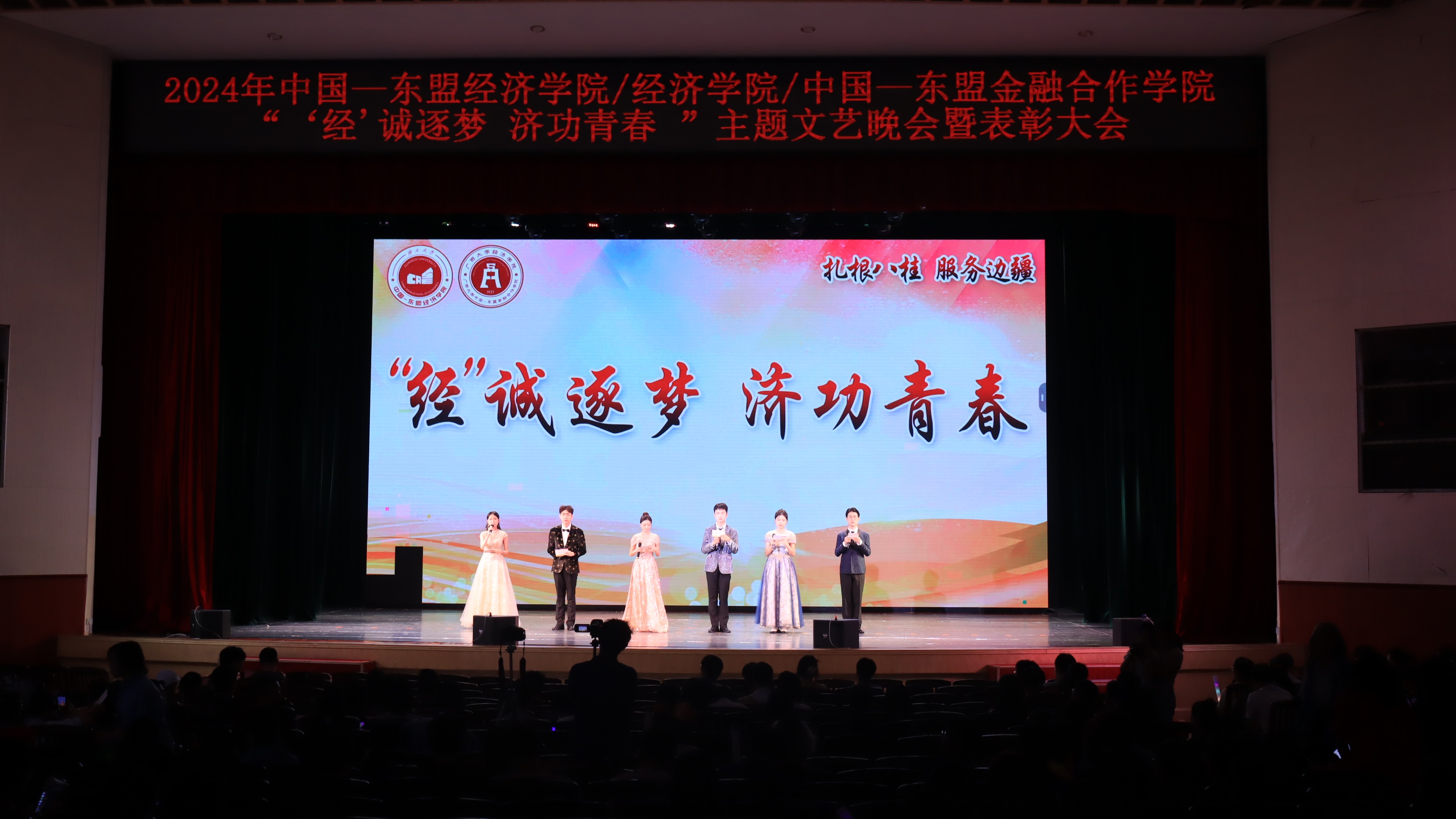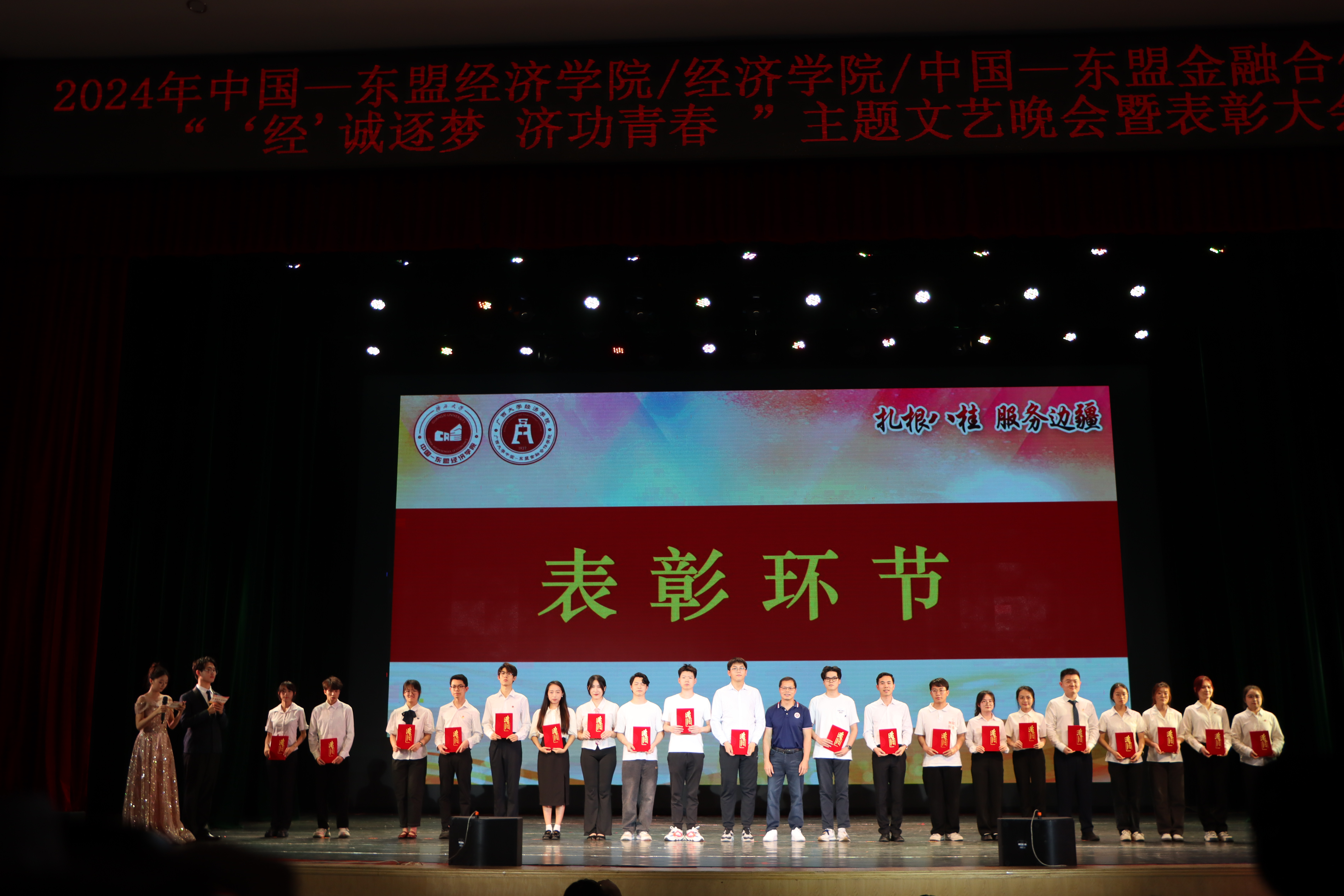 5月18日晚,beat365手机版官网入口beat365手机版官网入口/经济学院/中国—东盟金融合作学院2024年“‘经’诚逐梦,济功青春”主题文艺晚会暨表彰大会在学校大礼堂顺利举行。学院党委常务副书记罗诚、党委副书记陈卉娟、副院长梁权熙、学工组全体辅导员和学院部分教师出席活动。