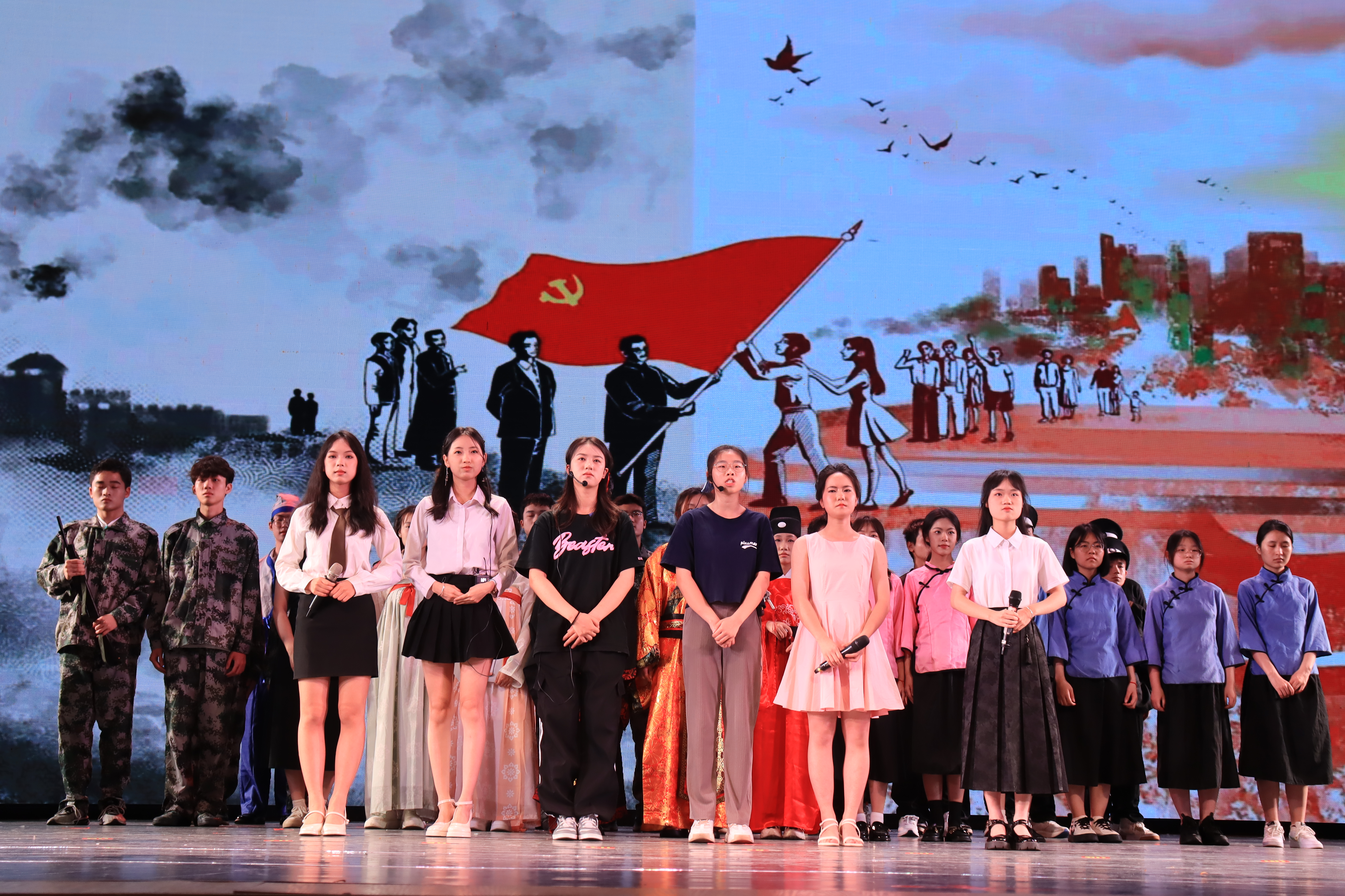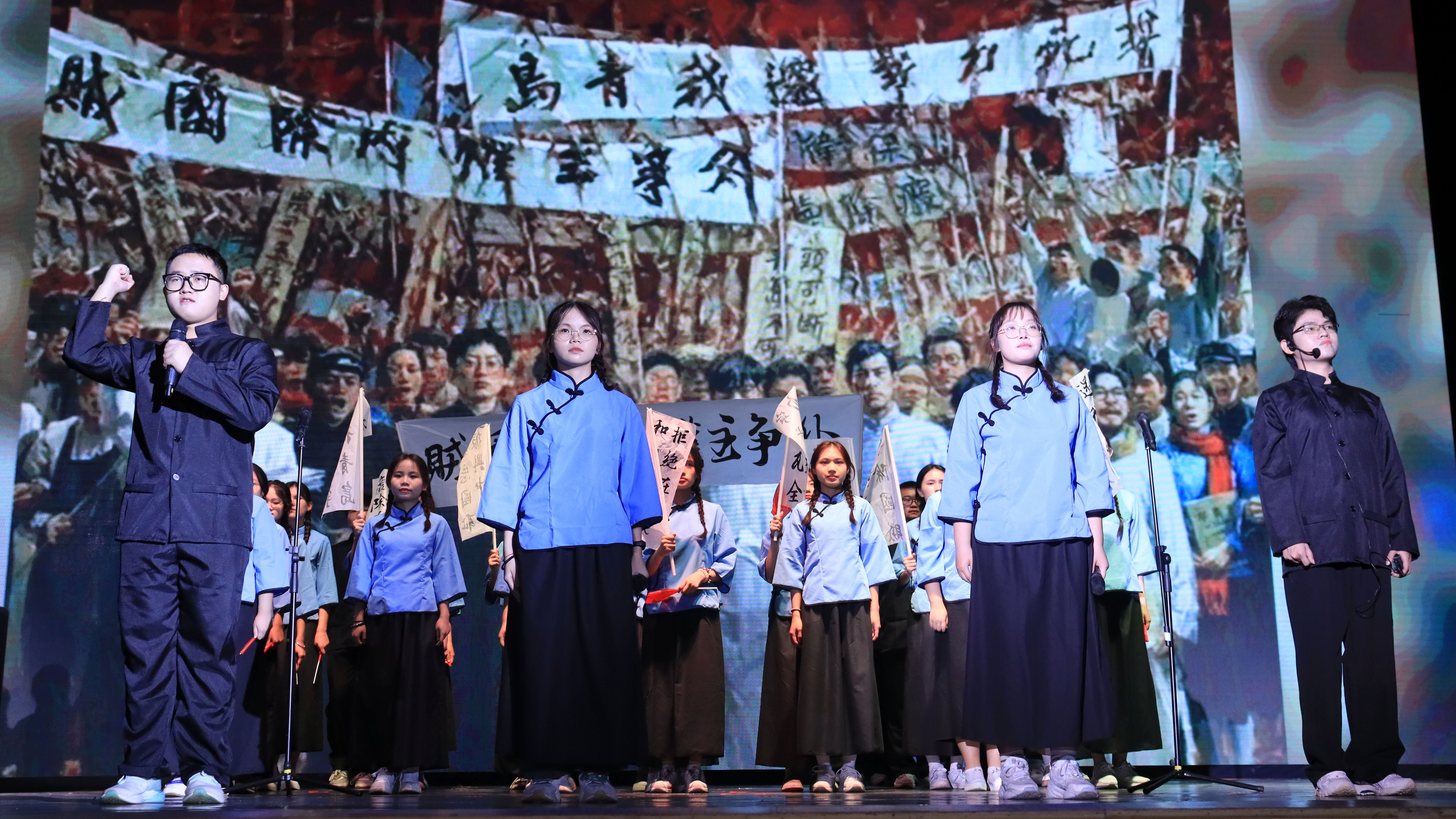 合唱《有我》用激昂嘹亮的歌声唱出了强国复兴“有我”的铮铮誓言;单元剧《薪火相传》演绎了不同历史时期,仁人志士们为国家统一、民族团结的壮丽故事;朗诵《如愿》不仅重现了五四时期青年们拳拳爱国之心,更用铿锵有力的话语、真挚的情感述说着青春不朽的责任与使命。