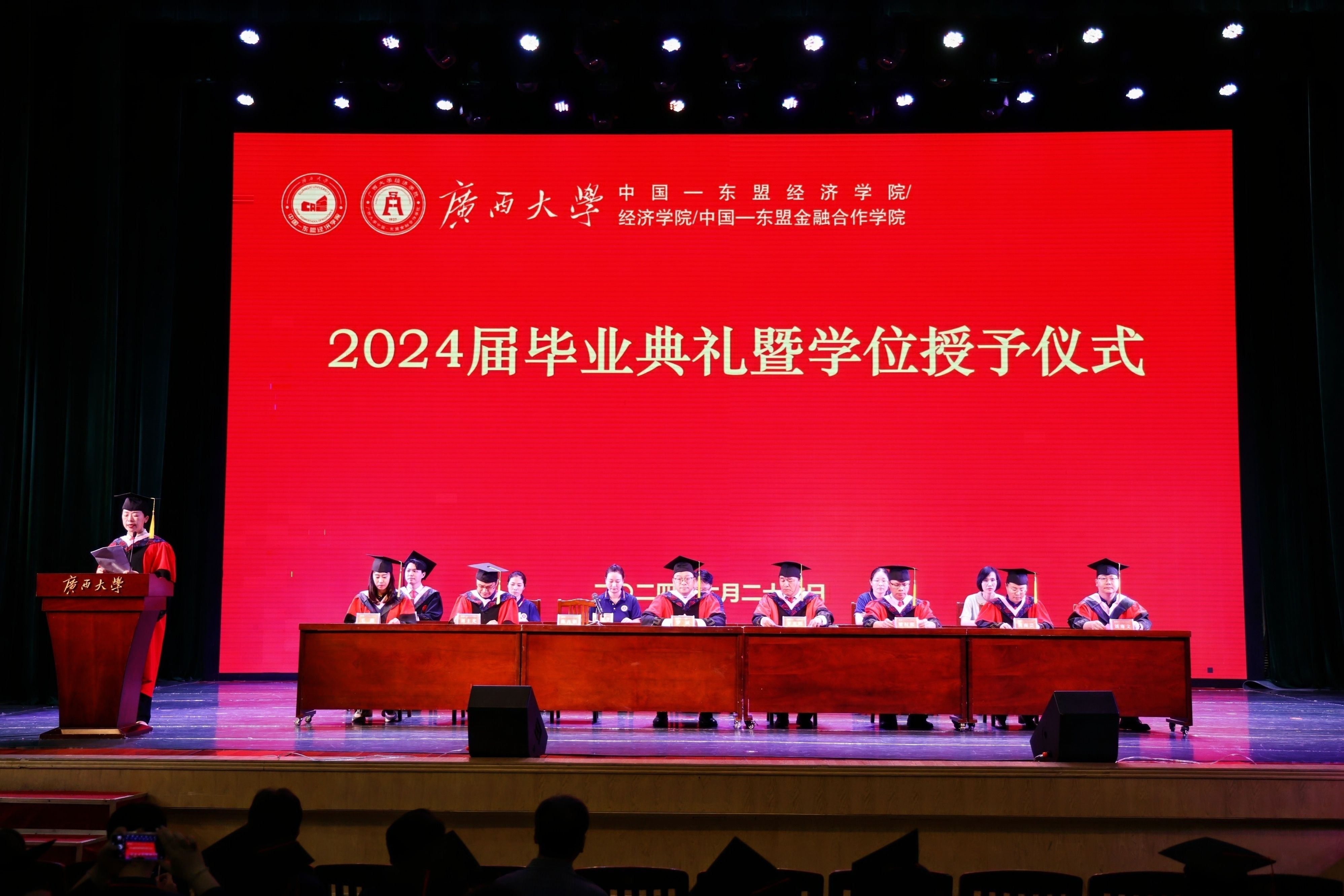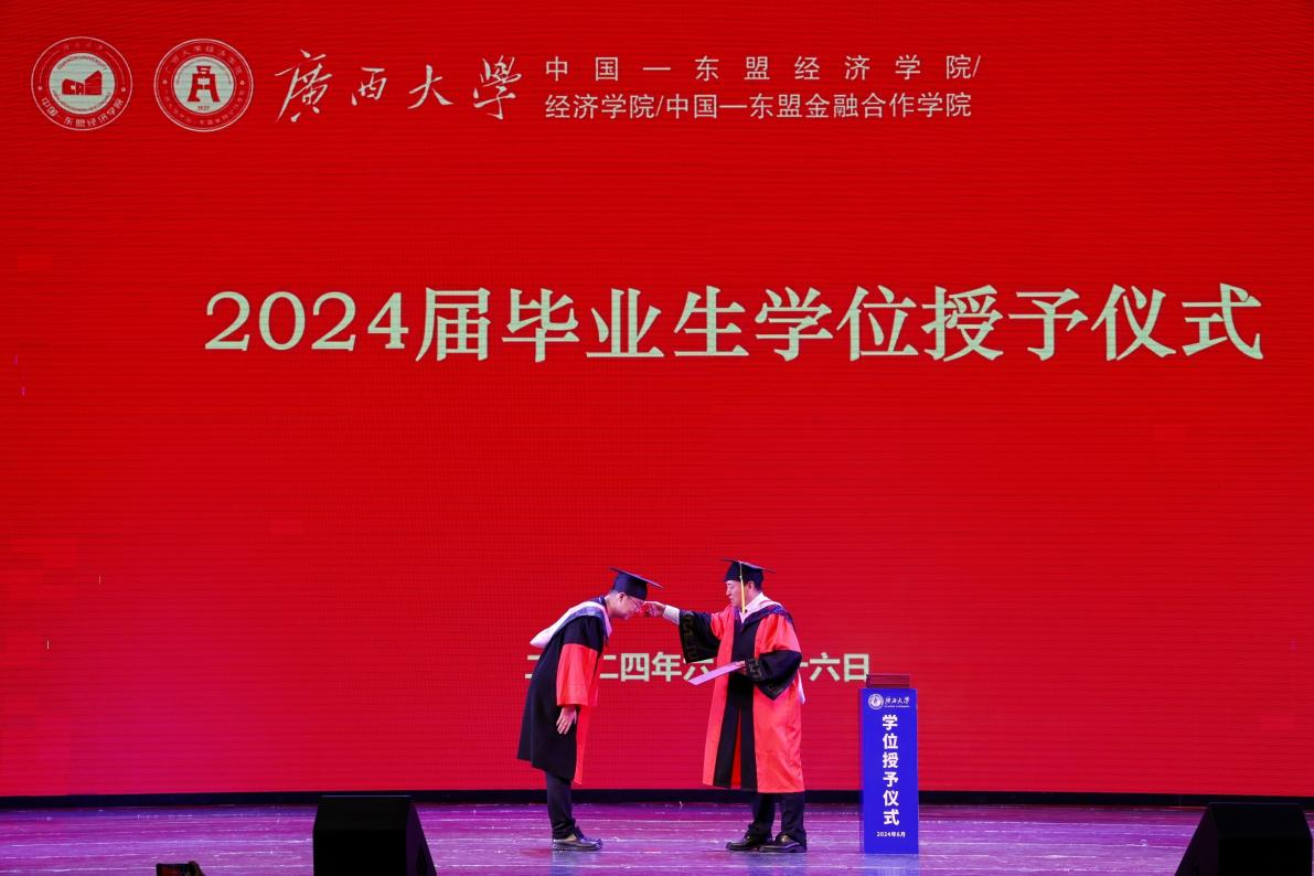 毕业典礼圆满结束后,2024届毕业生学位授予仪式开始。谭春枝副院长宣读学校授予毕业生学位的决定,beat365手机版官网入口第十四届学位委员会委员、beat365手机版官网入口/经济学院/中国—东盟金融合作学院学位评定分委员会主席李光辉院长为我院2024届毕业生逐一拨穗、授予学位,学院学位评定分委员会委员梁权熙、刘主光、郭南芸在主席台上肃立见礼,与毕业生一一握手。