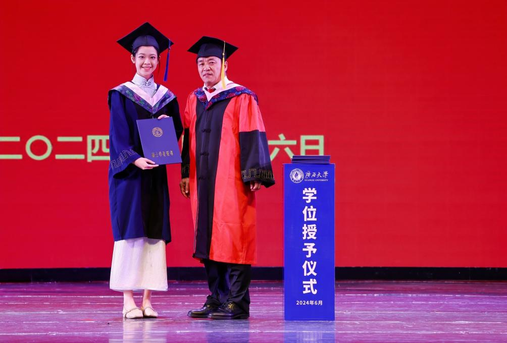 毕业典礼在雄壮的国歌声中拉开帷幕。典礼伊始,梁权熙副院长宣读学校准予学生毕业以及表彰优秀毕业生的决定;陈卉娟副书记宣读我院获得“2024届广西壮族自治区普通高等教育优秀毕业生”称号的毕业生名单;罗诚书记和李光辉院长为优秀毕业生代表颁发毕业证书、赠送毕业礼物。