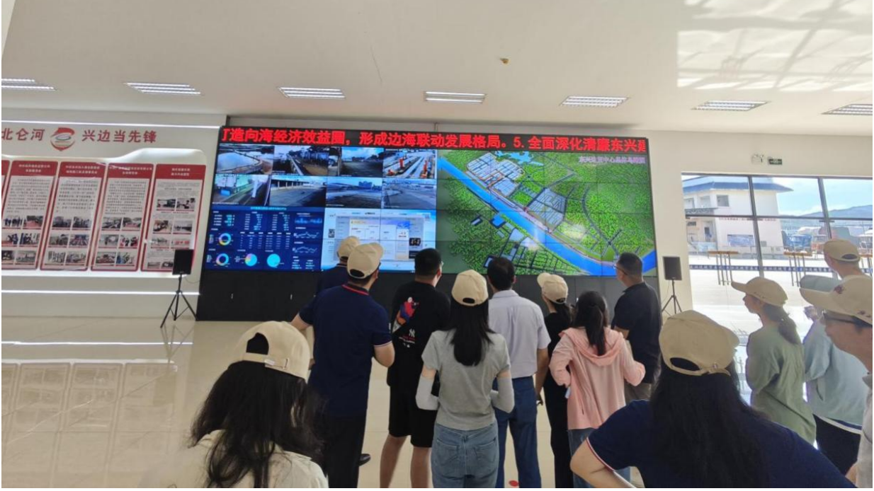 在东兴边贸中心综合服务大厅,师生们驻足东兴智慧边贸综合数字可视化平台前,了解掌握互市贸易一级市场和二级市场的关系与布局。