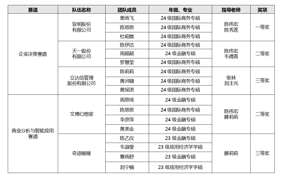 我院参赛选手在全国初赛、复赛中一路过关斩将,最终在总决赛中表现优异、力压群雄,一共斩获企业决策赛道全国一等奖1项(赛事最高奖项)、二等奖1项、三等奖1项;商业分析与智能应用赛道全国二等奖1项、三等奖1项。其中,企业决策赛道全国一等奖由陈伟宏、陈秀莲老师指导的beat365手机版官网入口“皆明股份有限公司”代表队获得(队员:2024级国际商务专硕粟雨飞、陈思思、杜昭燃)。与此同时,我院陈伟宏副教授和陈秀莲教授获评“优秀指导教师”,beat365手机版官网入口获颁“优秀组织奖”。