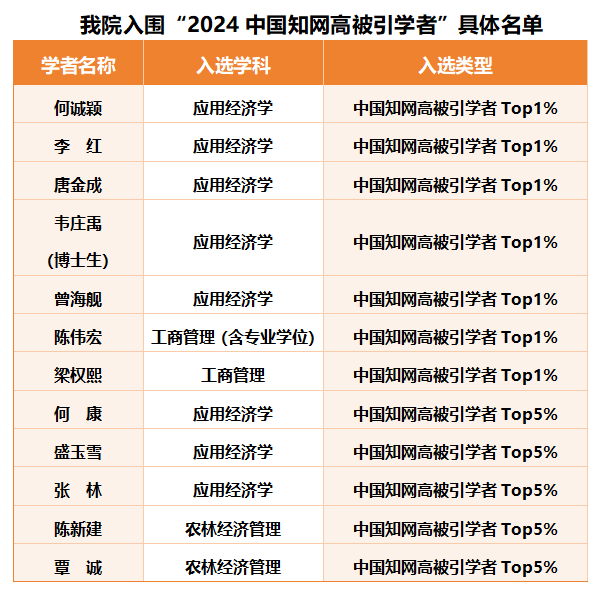 我院12位学者入选“2024中国知网高被引学者”名单。其中,7位学者入选“2024中国知网高被引学者Top1%”;5位学者入选“2024中国知网高被引学者Top5%”。