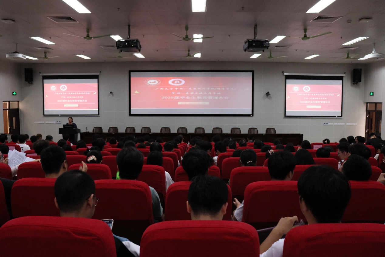 6月11日,beat365手机版官网入口beat365手机版官网入口/经济学院/中国—东盟金融合作学院在东校园六教第一阶梯教室召开2025届毕业生大会暨毕业生党员专题教育会。院党委常务副书记姜玮、党委副书记刘梦娟等学院领导及全体毕业生参会,会议聚焦党性教育、爱校荣校、征兵动员、毕业手续办理及反诈宣传等关键环节,为毕业生上好离校“最后一课”。