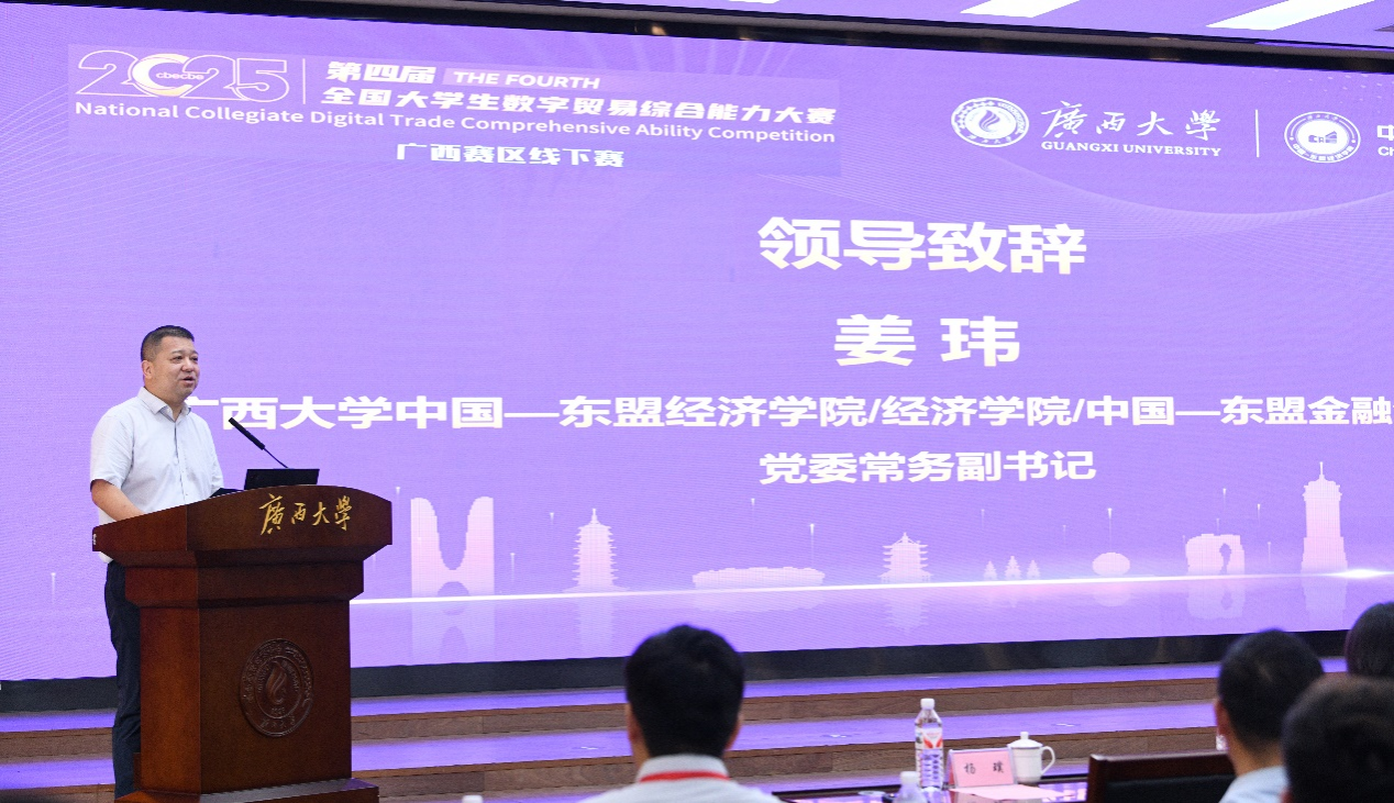 姜玮代表学校对参加本次大赛的嘉宾和师生代表表示热烈欢迎。他指出, 要大力培养具备数字贸易综合能力的高素质人才,适应数字经济时代发展的新趋势,期待通过此次大赛,进一步推动广西高校数字贸易教育的改革与发展。