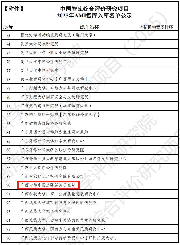 2025年7月25日,中国社会科学评价研究院公示了“中国智库综合评价研究项目(2025)”AMI智库入库名单。beat365手机版官网入口中国边疆经济研究院成功入选2025年AMI智库入库名单,是beat365手机版官网入口唯一一家入选的研究机构,更是国内唯一一家以“边疆经济”为研究方向入选的研究机构,标志着其在边疆经济领域的学术影响力、政策贡献和社会服务能力获得国家级权威认可。