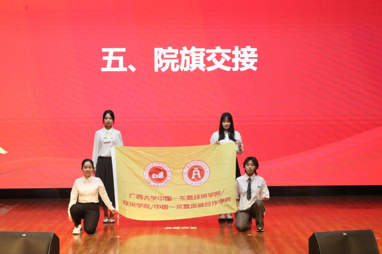 院旗交接仪式上,新老学生骨干代表郑重完成旗帜传递,象征着责任与精神的传承。在新任执行主席徐宝怡的带领下,全体新任学生干部面向院旗庄严宣誓:“恪尽职守,服务同学,奉献学院,携手共进!”铿锵誓言展现了新一届骨干的决心与担当。