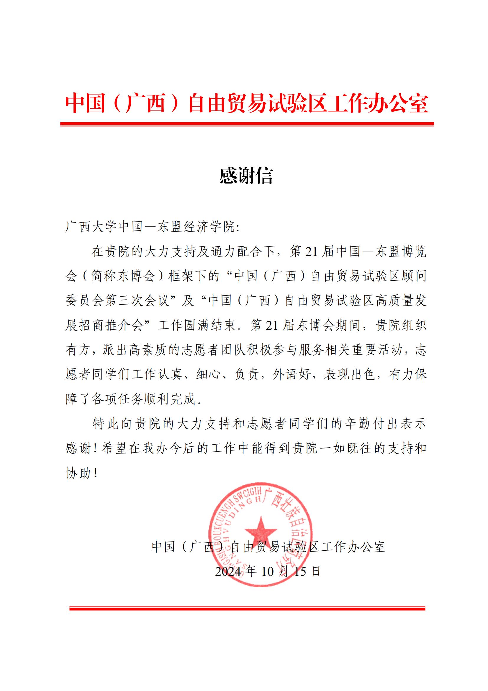 2024年10月我院收到中国(广西)自贸区工作办公室发来感谢信