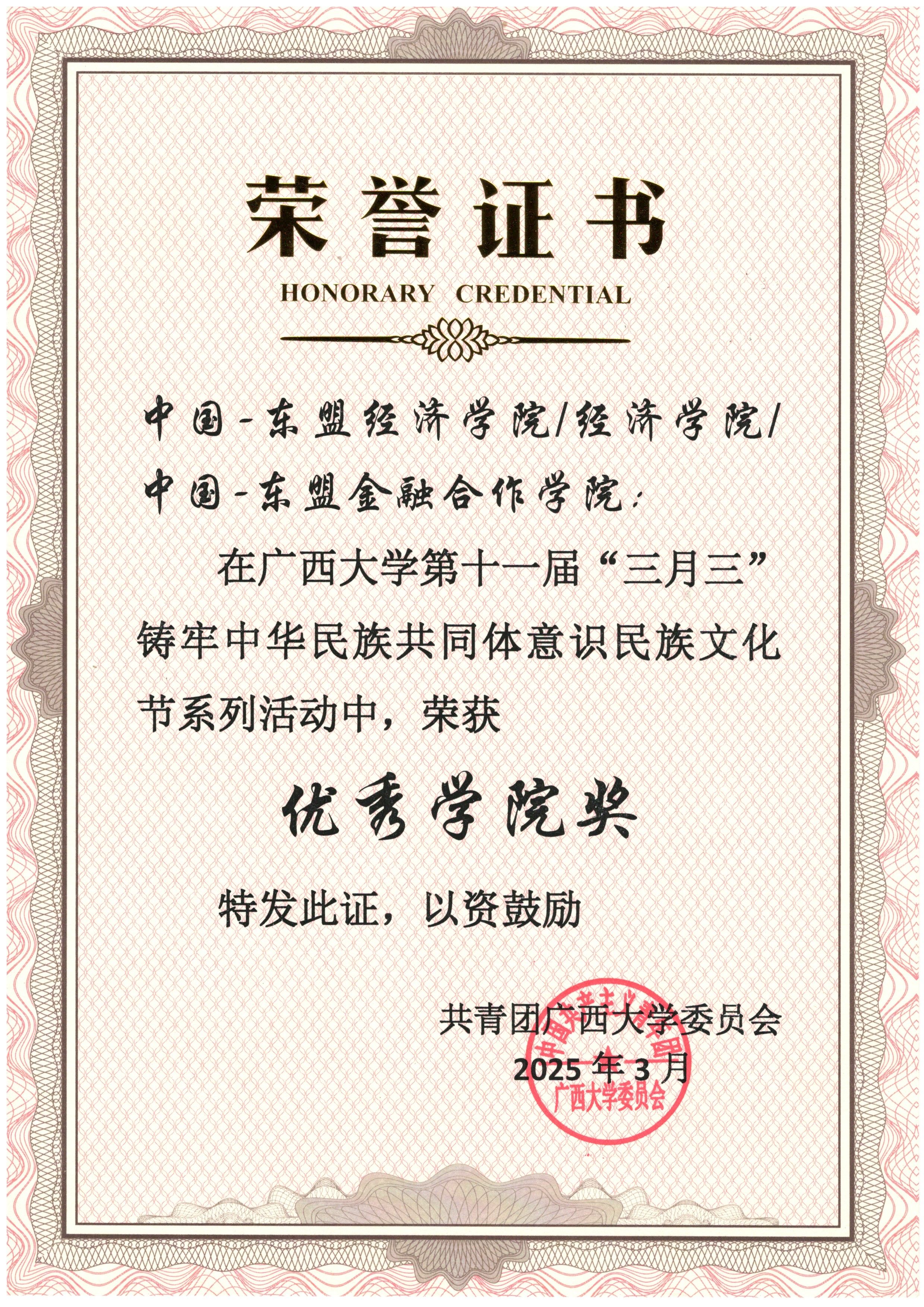 2025年3月我院获第十一届“三月三”铸牢中华民族共同体意识民族文化节优秀学院奖