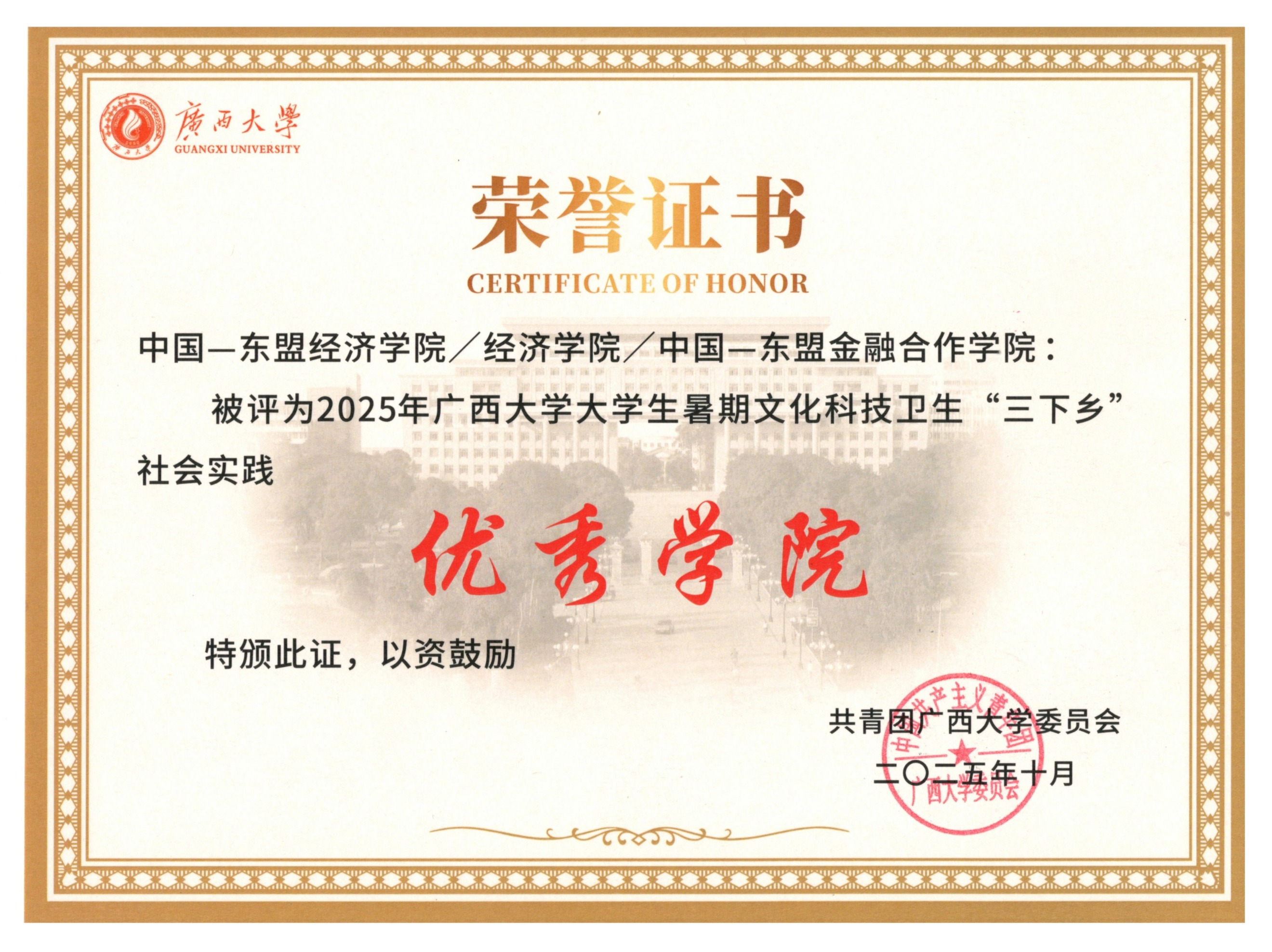 2025年10月我院获评beat365手机版官网入口大学生暑期文化科技卫生“三下乡”社会实践优秀学院