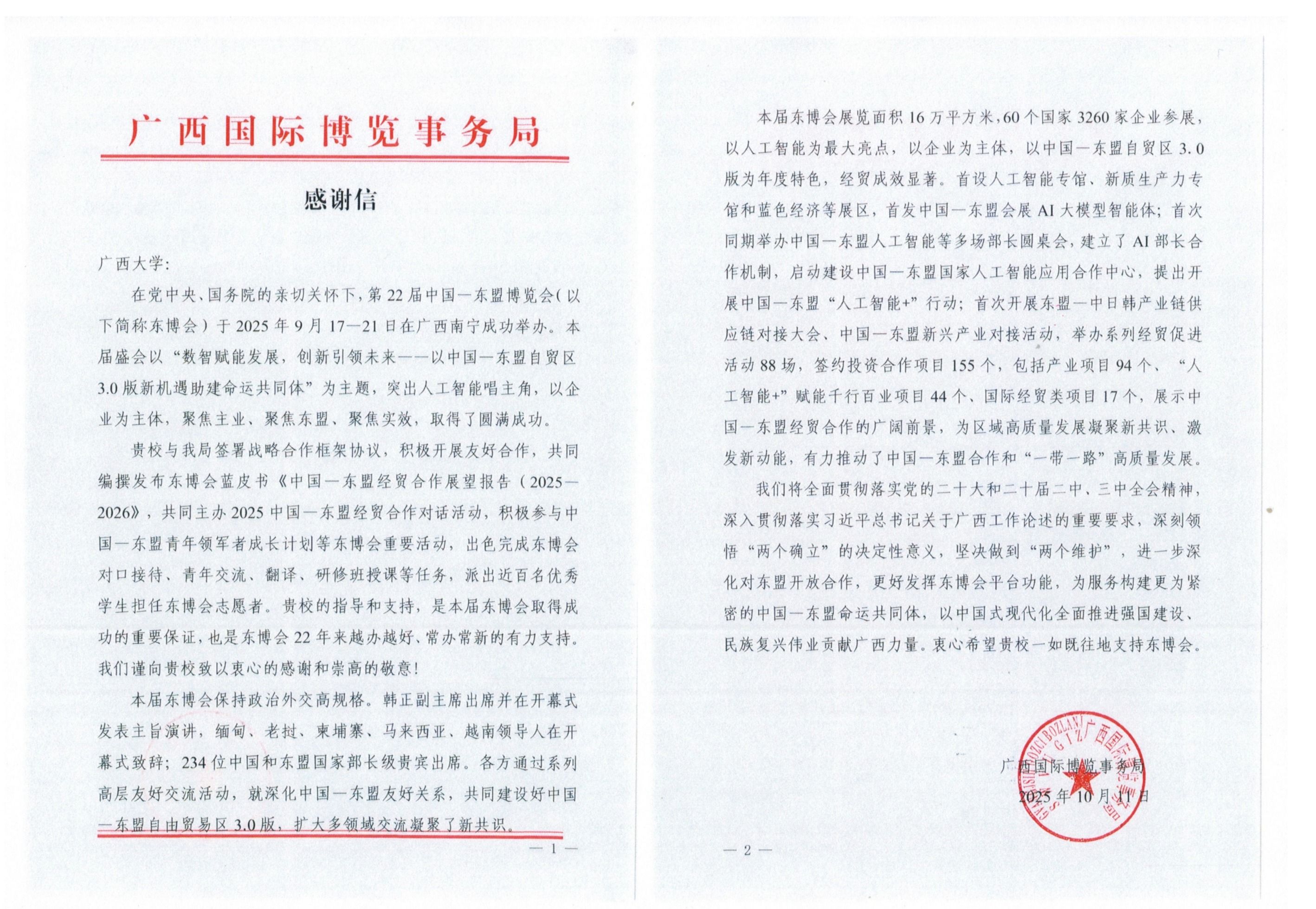 2025年10月我院收到广西国际博览事务局发来感谢信