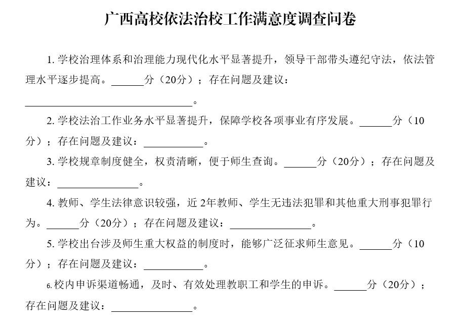为贯彻落实教育部、自治区党委关于积极开展依法治校达标建设和示范校创建工作的相关精神,推进我校依法治校工作高水平发展,按照《自治区教育厅 自治区司法厅关于开展全区大中小学校依法治校达标建设和示范校创建评估工作的通知》 (桂教政法(2023)4号) 的部署和要求,需以网络问卷的形式开展依法治校工作满意度调查。