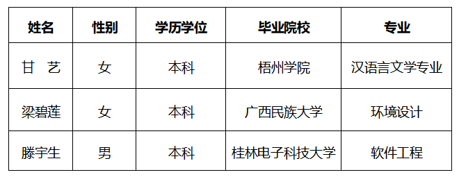我院通过广西四方汇通人才服务有限责任公司面向社会公开招聘劳务派遣制工作人员3名,根据相关工作方案,经初筛、笔试、面试、复试等程序,现将拟聘用人员公示如下: