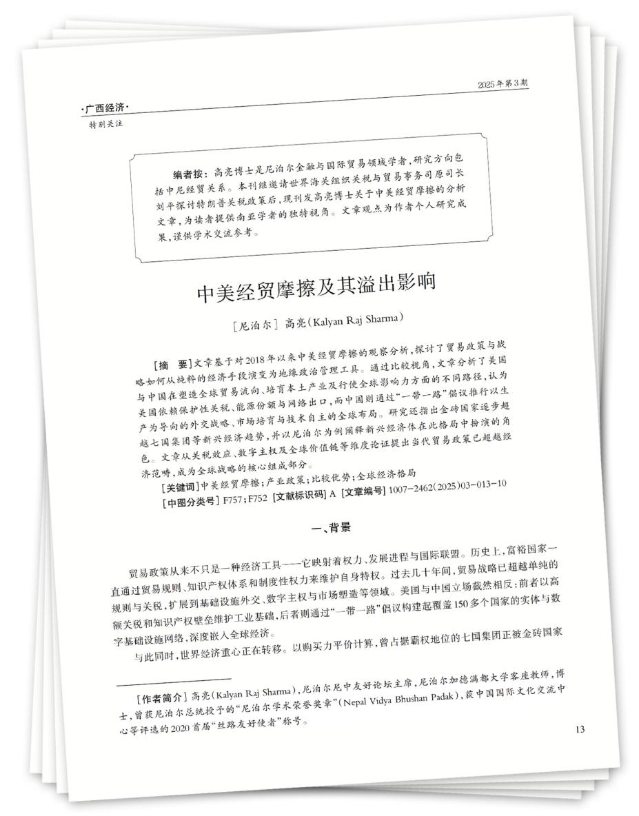 [摘 要]文章基于对2018年以来中美经贸摩擦的观察分析,探讨了贸易政策与战略如何从纯粹的经济手段演变为地缘政治管理工具。通过比较视角,文章分析了美国与中国在塑造全球贸易流向、培育本土产业及行使全球影响力方面的不同路径,认为美国依赖保护性关税、能源份额与网络出口,而中国则通过“一带一路”倡议推行以生产为导向的外交战略、市场培育与技术自主的全球布局。研究还指出金砖国家逐步超越七国集团等新兴经济趋势,并以尼泊尔为例阐释新兴经济体在此格局中扮演的角色。文章从关税效应、数字主权及全球价值链等维度论证提出当代贸易政策已超越经济范畴,成为全球战略的核心组成部分。