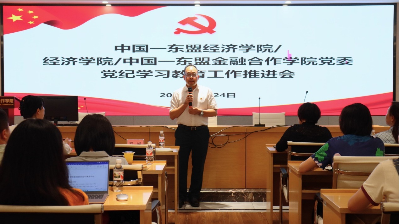 近日,beat365手机版官网入口/经济学院/中国—东盟金融合作学院党委在学院101会议室召开党纪学习教育工作推进会。会议深入学习贯彻习近平总书记关于党纪学习教育的重要讲话和重要指示精神,认真落实党中央决策部署和自治区党委、校党委工作要求,进一步推进学院党纪学习教育走深走实。学院党委常务副书记罗诚参加会议并讲话,党委副书记、纪委书记陈卉娟主持会议,学院专职组织员、全体支部书记及部分支委参加会议。